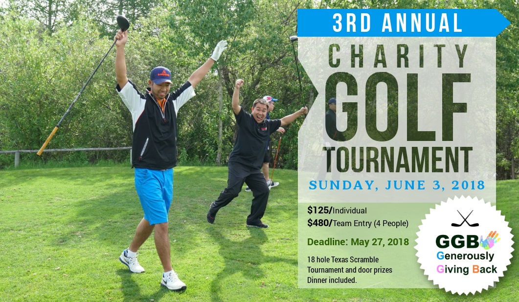 We are pleased to host our third annual golf tournament at Goose Hummock Golf Resort, located 20 minutes north of Edmonton (Relative Location: 3 kilometers North of the Town of Gibbons, AB. 1 kilometer West of Highway 28 on Township Road 564, close to Jurassic Forest). All funds generated from this event will be directed towards our charity projects. Everyone of all ages are invited! =========================================== PURCHASE TICKETS AT: https://ggb-golf-tournament.eventbrite.ca/ =========================================== FEES: Individual: $125 Team Entry (4 People): $480 – Save $20 by registering as a team! Dinner Only: $35 FEES INCLUDE: 18 hole Texas Scramble Tournament with shotgun start times* Power carts for every pair of players* 10% off of all regularly priced merchandise from the Pro Shop* Access to driving range for some practice before the game* AAA Alberta Beef steak lunch and complete fixings to follow * Please note, these do not apply for Dinner Only. EARLY BIRD REWARD: When you register by midnight May 1st, 2018, you have a ticket entered into an early-bird-only door prize. AGENDA: 8:00 a.m. Registration begins 8:50 a.m. Head to designated starting holes 9:00 a.m. Shotgun start 2:00 p.m. Steak lunch 3:00 p.m. Prizes Goose Hummock Golf Resort has a wonderful dinning room serving breakfast starting at 7 am for those interested on the day of the tournament. Feel free to take in a small meal and warm up on the driving range before the tournament begins. Additional charges apply. PRIZES: Chance to win a $2500 prize with hole in one, sponsored by Goose Hummock Golf Resort Closest to the pin (men and women) Longest drive (men and women) Longest putt (adults and children) Best overall team score Worst overall team score Most shots from the sand Most balls in the water Door prizes MULLIGANS: $5/mulligan 50/50 TICKETS: $5/5 ticket, $10/10 tickets or $20/20 tickets. CHIPPING CONTEST: Each successful chipping attempt will be entered to win a prize. FOOD ALLERGIES: Please identify your food allergies under the Meal Option during Checkout. Goose Hummock will try to accommodate to the best of their abilities. NOTES: Tickets are non-refundable. A minimal service charge will be added. To avoid being placed in random teams, we highly recommend that you purchase in pairs or set yourself a group of 4. Dress code to be enforced: collared shirts, soft spiked shoes, no jeans or ripped clothing. ——————————————————— SPONSOR A MERCHANDISE BUNDLE: $975 – Branded Golf Balls and Pack of Tees – A pack of 3 branded golf balls displaying your company logo (imprint area on golf ball is size of a quarter – 23.88mm or 0.94″ in diameter). Clear plastic package will also display logo. – A pack of 5 tees (bag will display your logo) to be included – Opportunity to include company promotional material in each player’s participation package. $750 – Branded Golf Towels – A branded golf towel displaying your logo (imprint area is 127mm x 127mm or 5″ x 5″) – Opportunity to include company promotional material in each player’s participation package. All sponsors will have logo prominently on GGB’s main event page, and Eventbrite page. It will also be on GGB’s main sponsor page (logo and link), Twitter, Instagram, Facebook, and be acknowledged in the dinner speech. Sponsors will have a tax receipt for amount to claim as “advertisement”. Deadline and logo must be provided to GGB by Friday, May 1st, 2018. SPONSOR A HOLE: $300/hole, $400/2 holes – 1ft X 2ft sign – Sign at sponsored golf hole with company logo – Tax receipt for amount to claim as “advertisement” – Company logo on GGB brochure – Company logo on GGB website Sponsors page (link included) for 12 months (June 2018 to June 2019), and Event page – Logo on Eventbrite page, Twitter, Instagram and Facebook – Acknowledgement in dinner speech Deadline and logo must be provided to GGB by Friday, May 25th, 2018. DONATE A TOURNAMENT PRIZE: – Tax receipt for retail value of prize donated as “donations”. – Company logo on GGB brochure. – Company logo on GGB website Sponsors page (link included) for 12 months (June 2018 to June 2019), and Event page. – Logo on Eventbrite page, Twitter, Instagram and Facebook. – Acknowledgement in dinner speech Deadline to donate is Monday, May 21st, 2018. NOTE: If you wish to make cash/cheque payments for a Merchandise Package Bundle or Hole Sponsorship, email contact@generouslygivingback.com. E-transfer payments can be made to sharlal@generouslygivingback.com. =========================================== PURCHASE TICKETS AT: https://ggb-golf-tournament.eventbrite.ca/ ===========================================