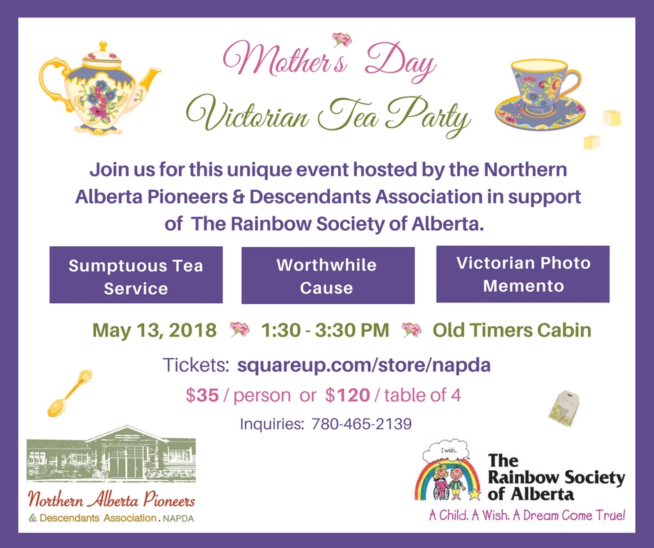 Join us for this unique event hosted by the Northern Alberta Pioneers & Descendants Association in support of the Rainbow Society of Alberta. You and your mother, wife, aunt or a mom-figure in your life get to enjoy sumptuous tea service, a Victorian memento photo, and support a worthwhile cause!