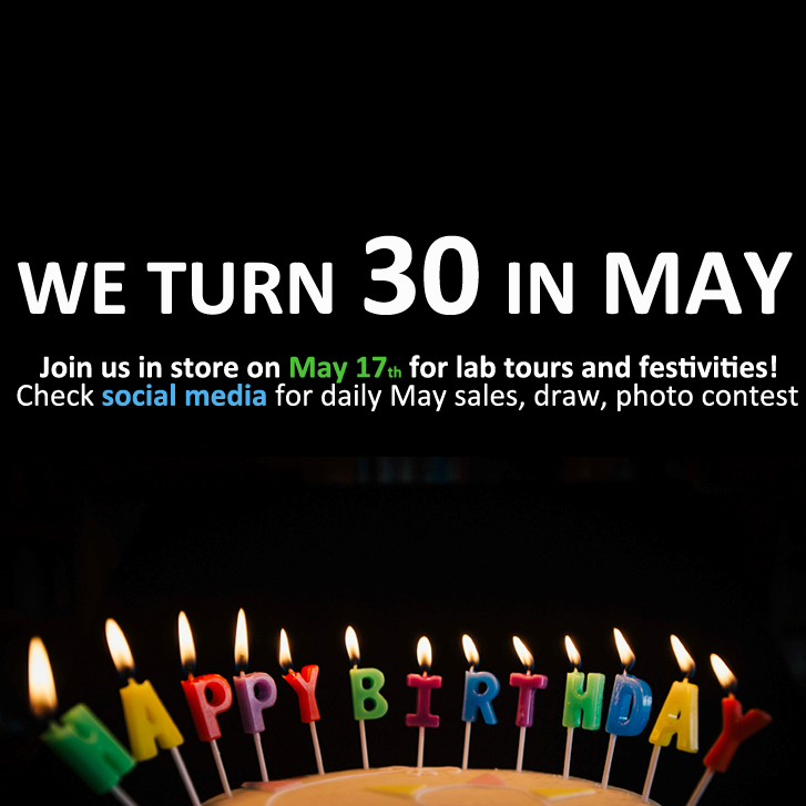 The Lab Works is celebrating 30 years in the photographic printing business! Come down to the store on May 17th, 2018 for lab tours, cake, coffee and giveaways! Come and see behind the scenes on how your prints are made!