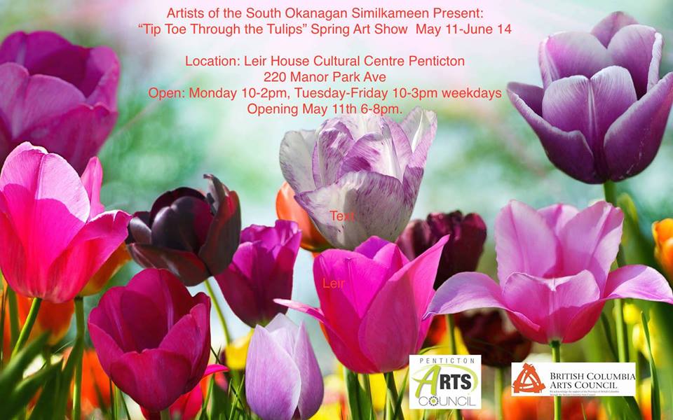 Join us as we celebrate spring with a collection of art that is blooming with colour and excitement. The Artists of the South Okanagan-Similkameen are pleased to be showing a collection of member works in their upcoming spring exhibit “Tip Toe Through the Tulips” at Leir House Cultural Centre, 220 Manor Park Avenue, Penticton B.C. Duration of exhibit: May 11-June 14 /2018 Hours: Monday 10am-2pm, Tuesday-Friday 10AM -3PM. For more information please visit our website at http://fca-sos.ca/show
