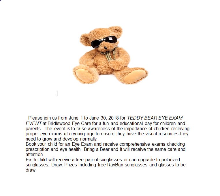 Please join us from June 1 to June 30, 2018 for TEDDY BEAR EYE EXAM EVENT at Bridlewood Eye Care for a fun and educational day for children and parents. The event is to raise awareness of the importance of children receiving proper eye exams at a young age and ensure they have the visual resources they need to grow and develop normally. Book your child for an Eye Exam and receive comprehensive exams checking prescription and eye health. Bring a Bear, and it will receive the same care and attention. Each child will receive a free pair of sunglasses or can upgrade to polarized sunglasses. Draw prizes include: free RayBan sunglasses and glasses to be drawn.