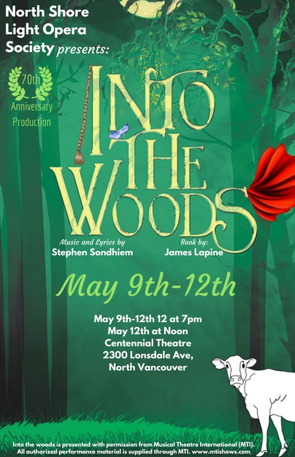 One of Sondheim’s most popular works, Into the Woods’ musical sophistication and lyrical richness are sure to delight audiences! Please be advised that this musical deals with mature subject matter. The story follows a Baker and his wife, who wish to have a child; Cinderella, who wishes to attend the King’s Festival; and Jack, who wishes his cow would give milk. When the Baker and his wife learn that they will remain childless because they have been cursed by the Witch next door, the two set out on a quest to find four objects to break the curse set upon them. On their search for a cow as white as milk, a cape as red as blood, hair as yellow as corn, and a slipper as pure as gold, they encounter Cinderella, Rapunzel, Jack, and many other fairy tale favorites, each of whom has wishes of their own. Through a series of actions, as everyone’s wishes come true, the consequences of their choices begin to haunt them with disastrous results. Featuring: Adam Darts (Narrator) Alex Crabtree (The Baker) Julia Rooney (Bakers Wife) Cassandra Szabo (Witch) Lauren Trotzuk (Little Red), Russel Cripps (Jack),Moriah Wax (Jack’s Mother) Nancy Hasiuk (Cinderella), Courney Dugan (Rapunzel), David Wallace (Mysterious Man), Linda Nobel (Granny), Tony Roper (Wolf), Meagan Bydan (Stepmother), Shante van Horlick (Florinda), Kendra Cordick (Lucinda), Paul Just (Cinderella’s Prince, Eric Biskupski (Rapunzel’s Prince), Ming-Xuan Chung (Stewart), Melissa Ratcliff (Cinderellas Mother/ Giant) and an living forest ensemble of trees and woodland creatures. Stage/Music Direction: Edette Gagné Assistant Stage Director/ Choreographer: Damon Bradley Jang Stage Manager/ Lighting Designer: Andy Sandberg Rehearsal pianist/ Assistant Music Director: Marc Petrunia . Producers: Andrea Mallard, Rodger and Nancy Nelson. Set Designer: Michael Epp Projections Designer: Joel Grinke Costume Designer: Nicolette Szabo The North Shore Light Opera Society (NSLOS) is a non-profit society that has been entertaining audiences on the North Shore since 1948. From The Mikado and Pirates of Penzance, to Die Fledermaus in 2017, NSLOS has consistently provided dedicated theatre goers with high quality shows on a local stage. As the oldest, continuously-producing musical theatre company in British Columbia, NSLOS has produced more than 70 shows in 69 years. For more information about NSLOS please visit www.nslos.com, or follow us on Instagram @northshorelightopera, or Facebook at North Shore Light Opera Society. Wed May 9th-Sat, May 11, 7:00, May 12th at 12:00pm and 7pm. Reserved seating. Adults $30.00, Seniors 65+ $25.00, Under 30/Students with ID $20.00 Tickets are a final sale. No refunds or exchanges.
