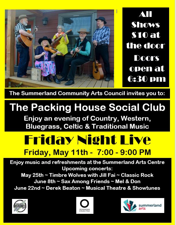Enjoy an evening of Country, Bluegrass, Celtic and Traditional music on Friday, May 11th with the Packing House Social Club from 7 to 9 pm. The Summerland Arts Centre, 9525 Wharton Street, downtown Summerland. Doors open at 6:30 and music starts at 7:00 pm. $10 at the door.