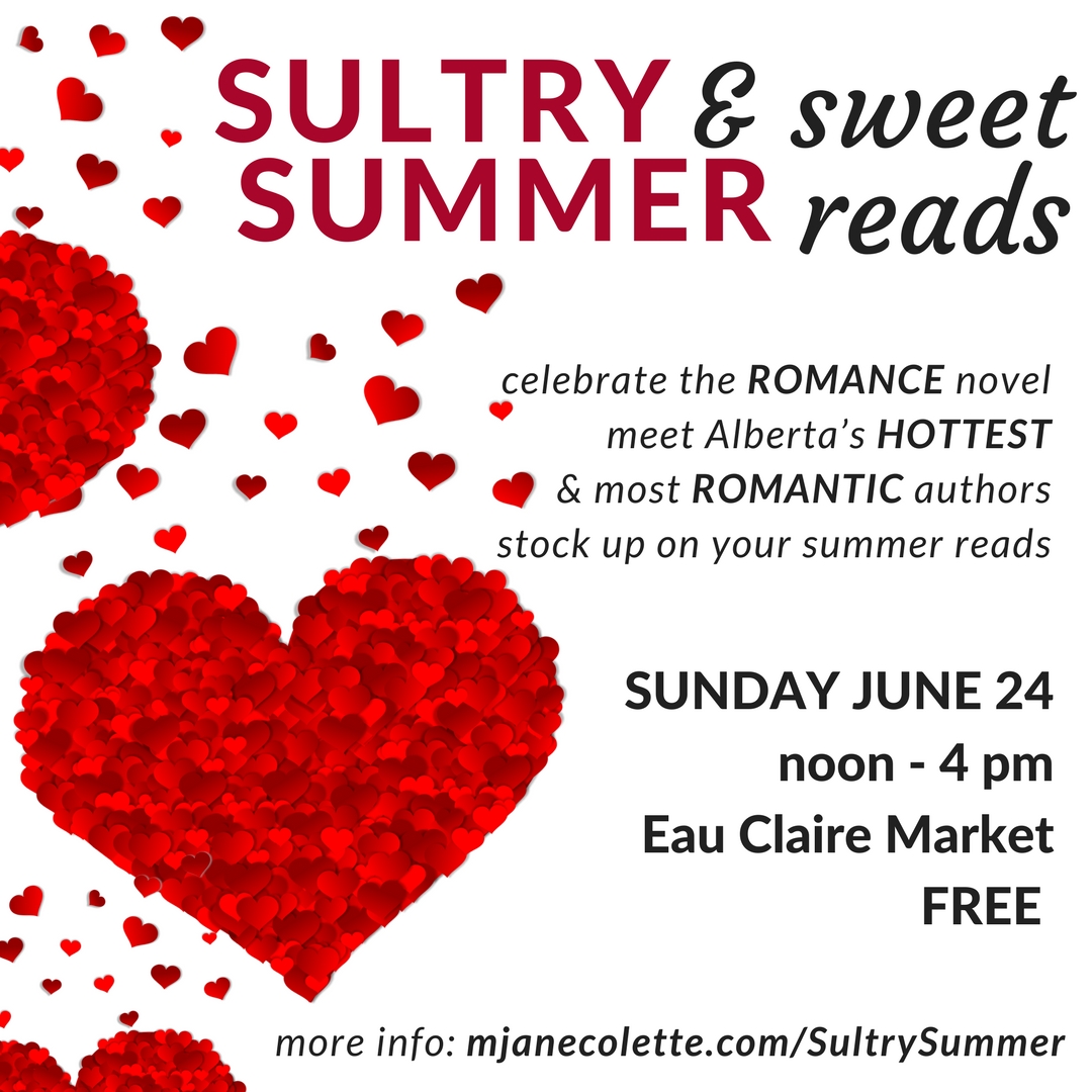 SULTRY & sweet SUMMER reads YYC: Start your summer by diving into sultry and sweet love stories with Calgary’s first romance reader festival! Come celebrate the romance novel and get up close and personal with some of the steamiest (and sweetest) local authors in the genre! SUNDAY JUNE 24 // noon to 4 pm // Eau Claire Market // FREE Featuring cameo performances by local dancers, readings by fabulous performers, author sightings and signings, games and prizes—lots of books, and, also SURPRISES. More information at mjanecolette.com/sultrysummer // TellMe@mjanecolette.com Featured local authors include Nancy M. Bell, Bernice Bohnet, Victoria Chatham, M. Jane Colette, B.C. Deeks, Amy Jo Fleming Rayanne Haines, Jenna Howard, Jilly Jaxx, Shelly Kassian, Elizabeth Kelly, Gwen Knight, Kymber Morgan, Katie O’Connor, Jan O’Hara, Alyssa Linn Palmer, Jude Pittman, Mahrie Reid, Brenda Sinclair, Suzanne Stengl, Billie Turner, and A. M. Westerling, and many more. Stay in the loop by RSVP’ing to the Facebook Event: https://www.facebook.com/events/2069175020030128/ or Event Brite https://www.eventbrite.ca/e/sultry-sweet-summer-reads-yyc-tickets-45107014294?aff=es2