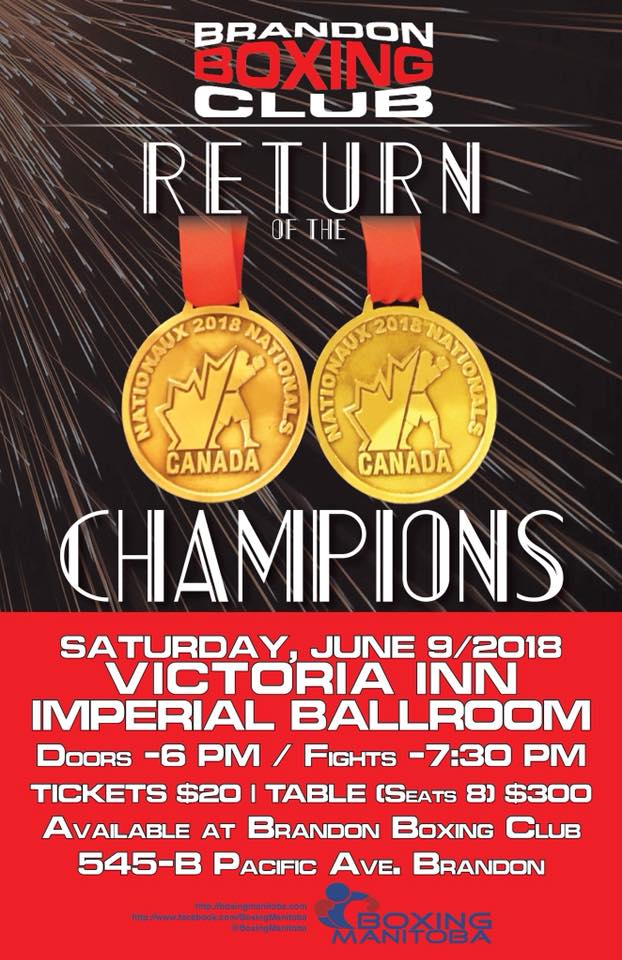 Brandon Boxing Club is hosting an event to celebrate the hard work and dedication of it’s two national medalists. We will also be trying a new fundraiser. We will have pieces or rolls of tape available for purchase to tape Noel Harding to the ring. For tickets please contact Noel at 204-570-2634 or hardingnoel@hotmail.com or stop by the boxing club at 545 Pacific Ave, Brandon.