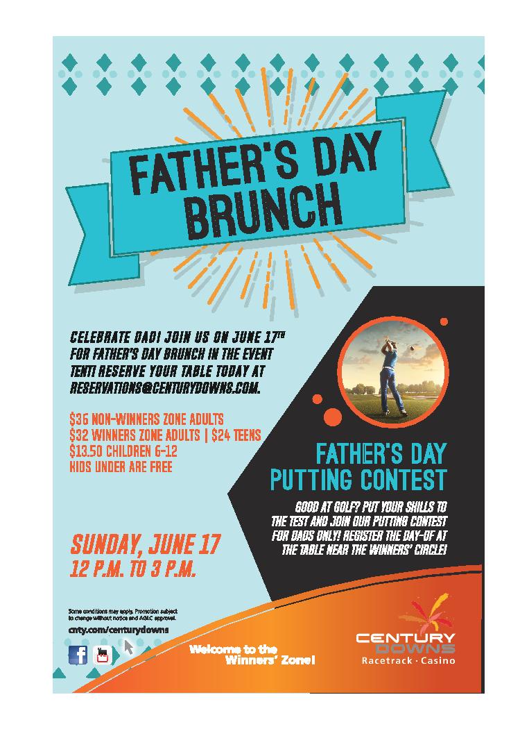 Celebrate Dad by joining us on June 17th for Father’s Day Brunch from 12-3 p.m. in the Century Downs Event Tent! Please reserve your table at reservations@centurydowns.com. After you’ve treated Dad to his Father’s Day Brunch, sign him up for the Father’s Day Putting Contest. This contest is for Dad’s only. Register on June 17th at the table near the Winner’s Circle.