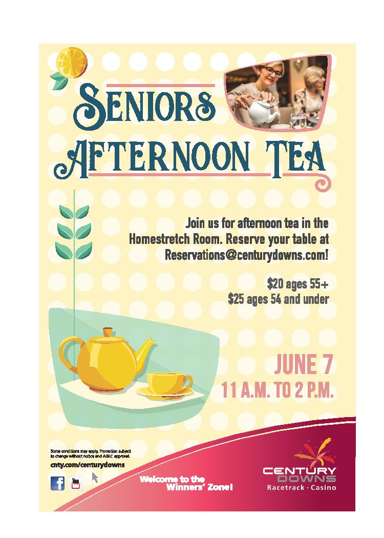 Join us for afternoon tea from 11 a.m. to 2 p.m. in the Homestretch Room at Century Downs Casino and Racetrack. Tea and baked goods will be severed. Reservations are recommended. Please email reservations@centurydowns.com.