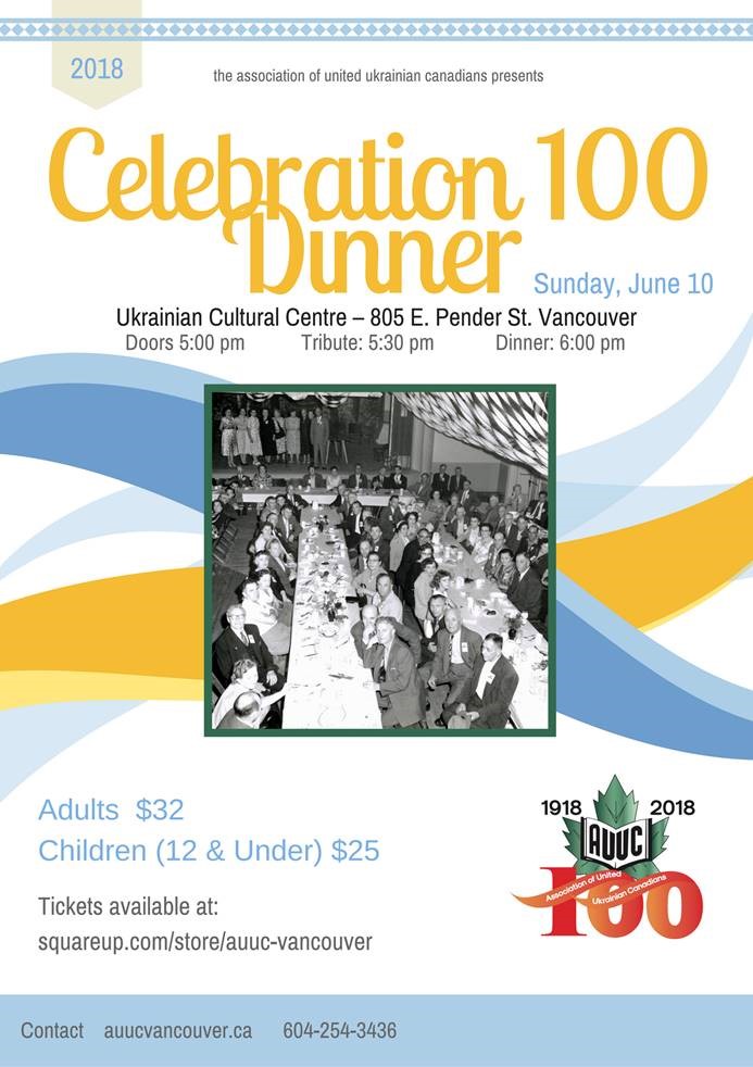 Enjoy a traditional Ukrainian dinner as we celebrate 100 Years in Canada and 90 Years in Vancouver. There will be some entertainment and speeches prior to the dinner. The Association of United Ukrainian Canadians will celebrate its 100th anniversary in an evening of song, music, and dance as they journey through their rich and proud history.