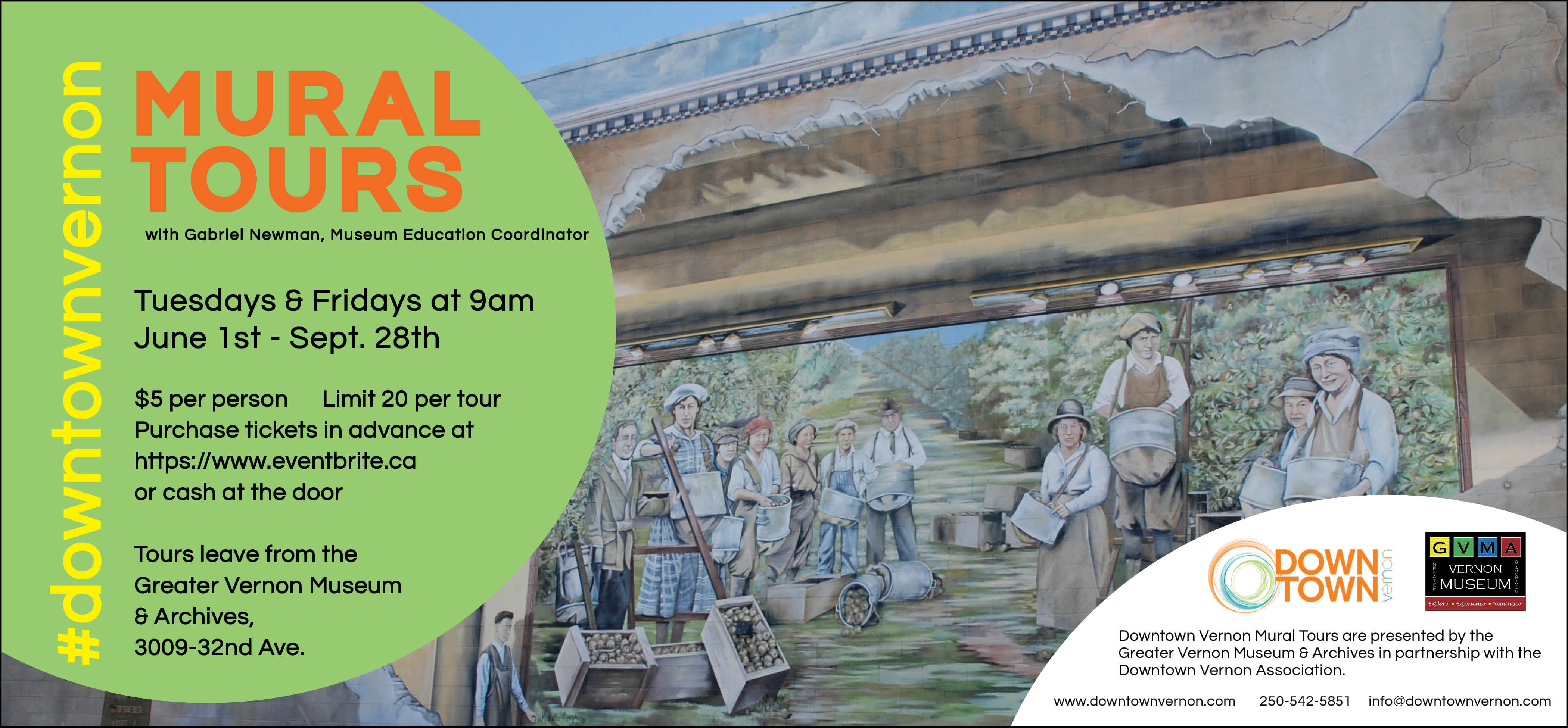 Join Vernon Museum Education Coordinator Gabriel Newman as he walks you through downtown Vernon sharing anecdotes and history that inspired Vernon’s outdoor art gallery. These works of art created by a collaboration of artists depict the history, culture, scenery, and folklore that have made Vernon what it is today. Mural Tours leave the Greater Vernon Museum & Archives, 3009-32nd Ave., Tuesdays and Fridays at 9am, June 1st to September 28th. Limited to 20 per tour. Tickets can be purchased in advance at https://www.eventbrite.ca or at the door for $5.00 cash only please. The Downtown Vernon Mural Tours are presented by the Greater Vernon Museum & Archives in partnership with the Downtown Vernon Association. For more information contact the DVA at 250-542-5851, info@downtownvernon.com or the GVMA at 250-542-3142, mail@vernonmuseum.ca.