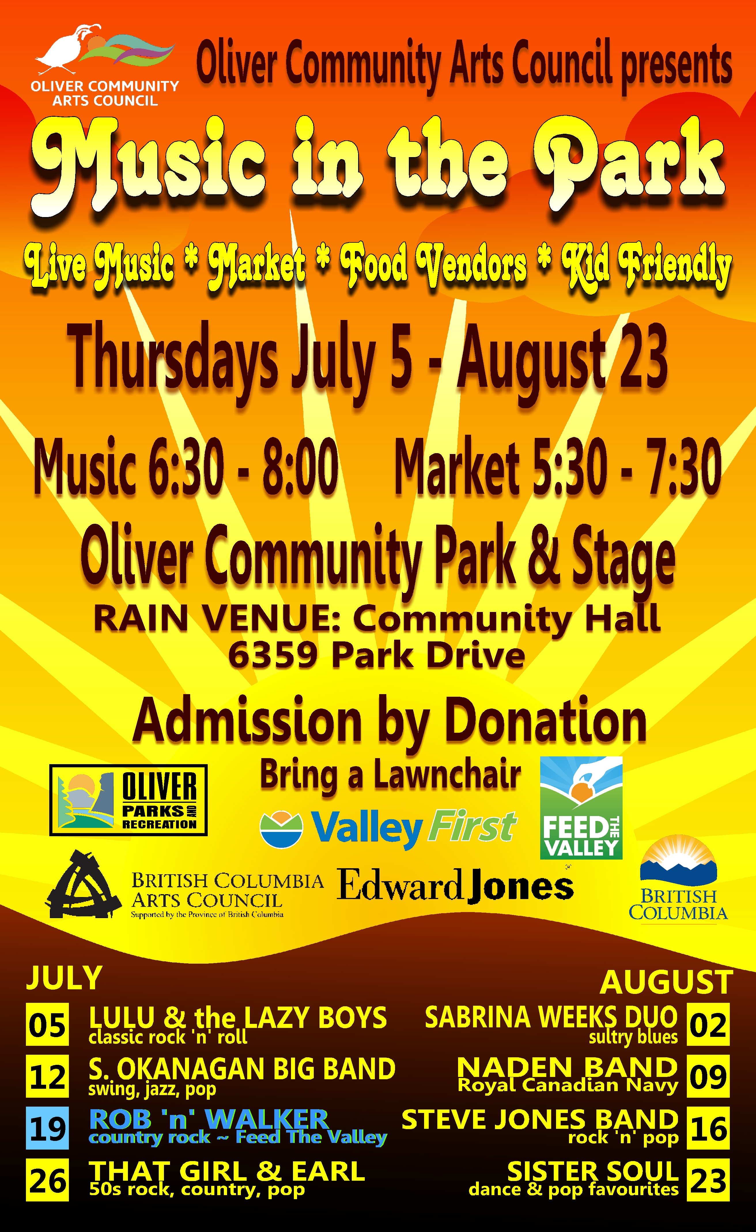 Thursday July 19: Rob ‘n’ Walker at Music in the Park. Country rock, Americana. Thursdays 6:30 – 8:00 p.m. Oliver Community Stage bandshell. Rain venue: Oliver Community Hall. 6359 Park Drive. Admission by donation. Feed the Valley concert. Oliver Food Bank goods welcome. Bring a lawnchair. Info: OliverCAC@gmail.com 250-498-0183