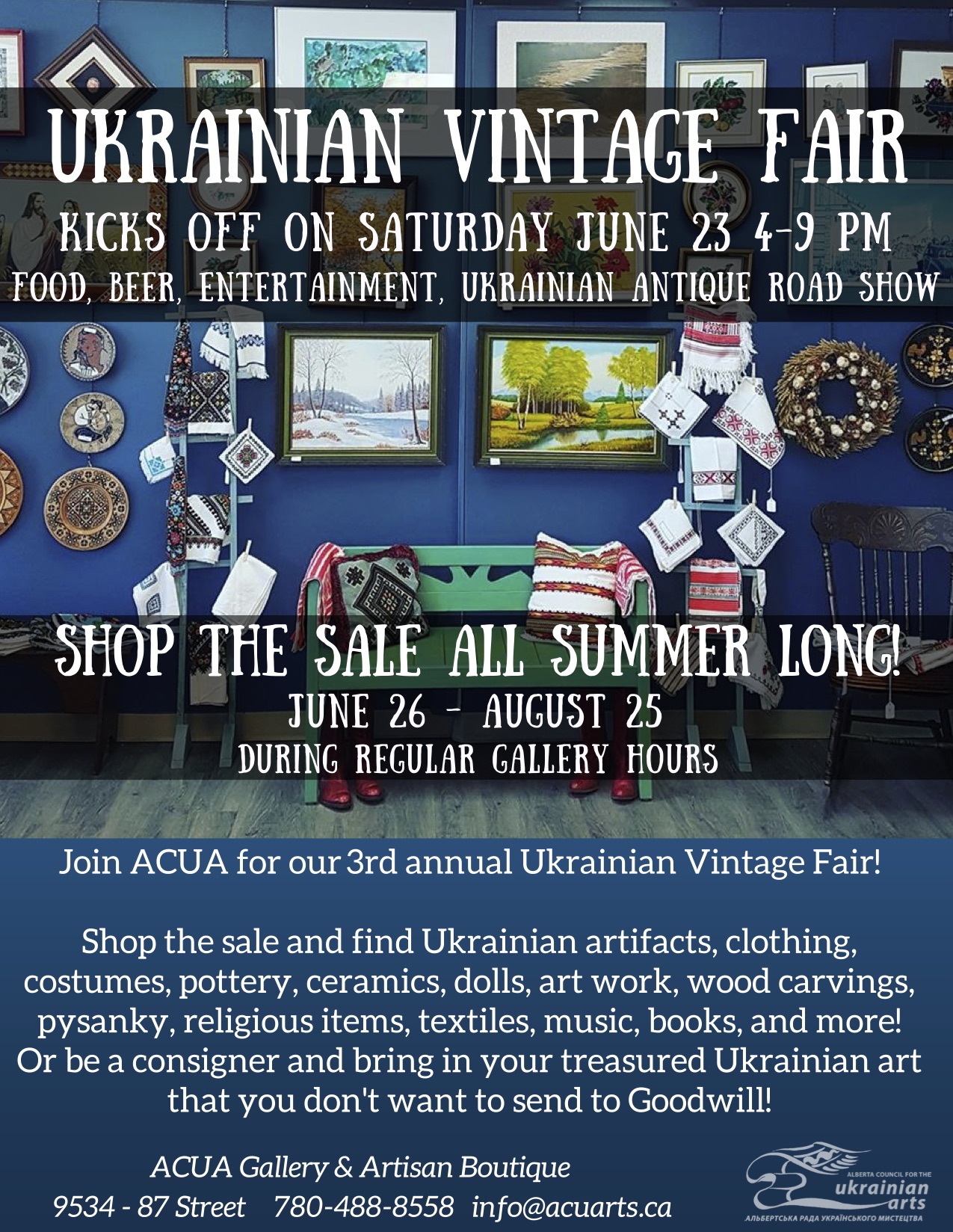 Join Alberta Council for the Ukrainian Arts for our 3rd Annual Ukrainian Vintage Fair! We will have unique and fun items for you to buy including artifacts, pottery, ceramics, dolls, art work, wood carvings, pysanky, religious items, linens, textiles, music, books, cookbooks, clothing, costumes, and more! The Ukrainian Vintage Fair will kick off on June 23 from 4 p.m. to 9 p.m. Be the first to shop the Ukrainian Vintage sale and enjoy food trucks, beer garden, entertainment, and our version of Ukrainian Antique Road Show! If you can’t make the kick off event, shop the sale June 26 to August 25 during regular gallery hours which are on our website