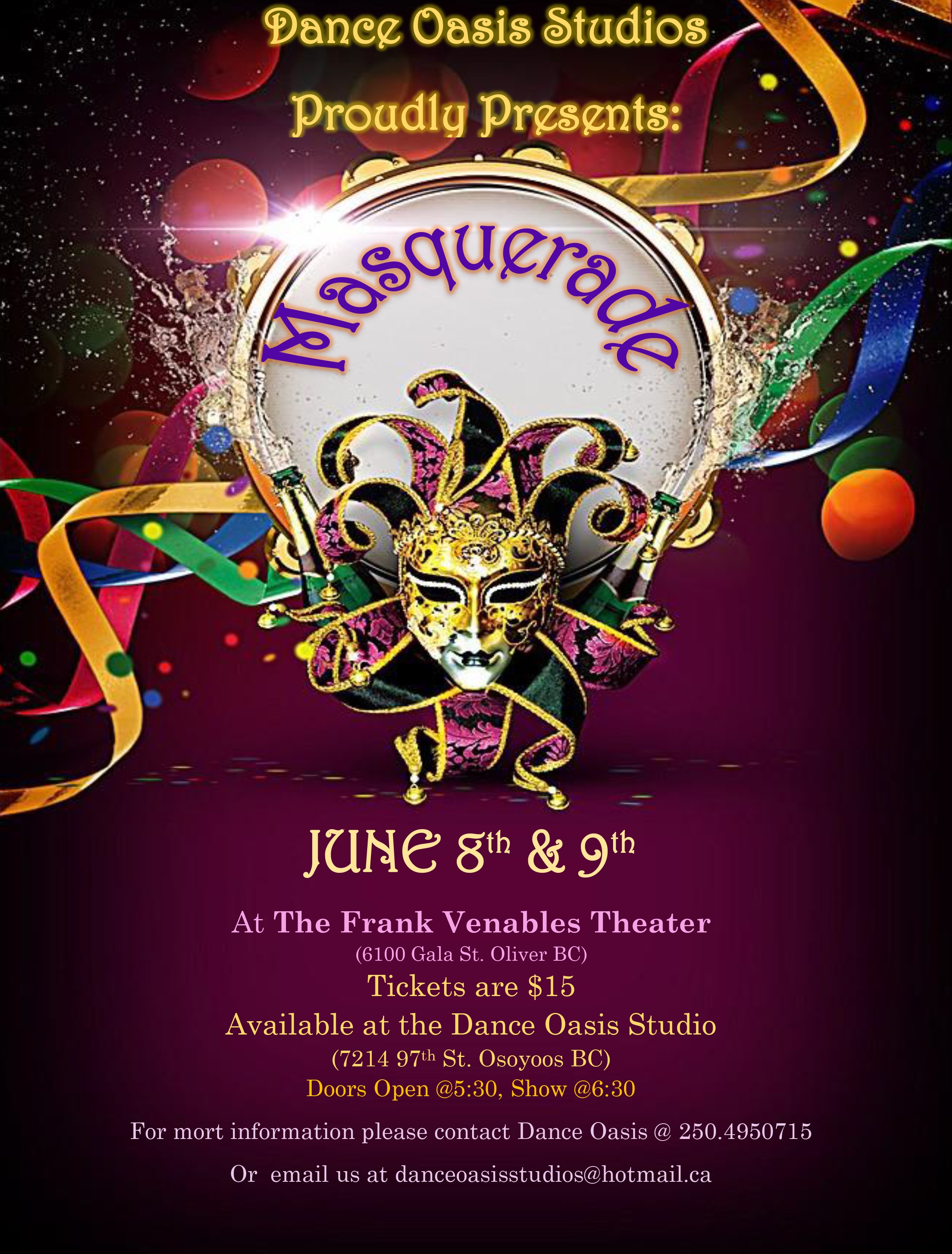 Friday June 8 & Saturday June 9 at 6:30 MASQUERADE Dance Oasis Studios – Osoyoos Presenting the 9th Annual Dance Oasis Studios Year End Recital, Masquerade! Join us for a night of entertainment, beautiful costumes and dazzling dances. Costume and masks encouraged! This is sure to be a night to remember! Get your tickets before the sell out. To view the full poster click here. TICKETS: $15 sold at Dance Oasis Studios, 7214 97th Street Osoyoos, or through email transfer at danceoasisstudios@hotmail.ca