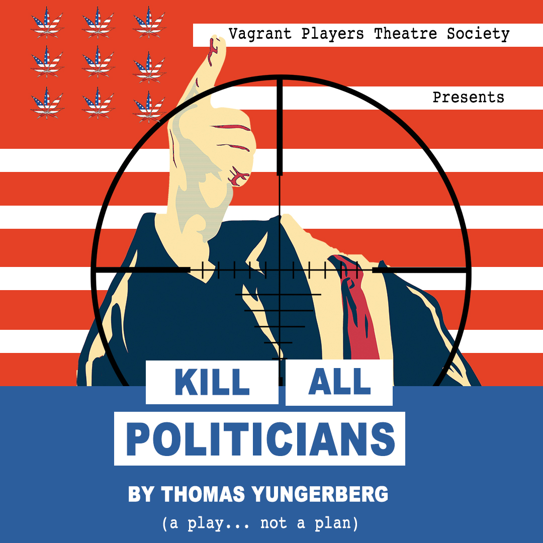 Event EndedVagrant Players Theatre Society presents the Canadian premiere of Kill All Politicians, a one-act comedy about the politics of friendship. Washington DC twentysomethings Stu and Ben are bored, stoned, and spending another night inexpertly dissecting senatorial vote-trading when a parking ticket sends Stu over the edge. As he plots to rid America of political misbehaviour once and for all, Ben begins to wonder if his friend’s vitriol stems from problems closer to home. Directed by Cody Kearsley and Megan Peta Hill. Featuring Brad Bergeron, Carson Bokenfohr, Arthur MacKinnon, Megan Peta Hill, and Julia Lank.