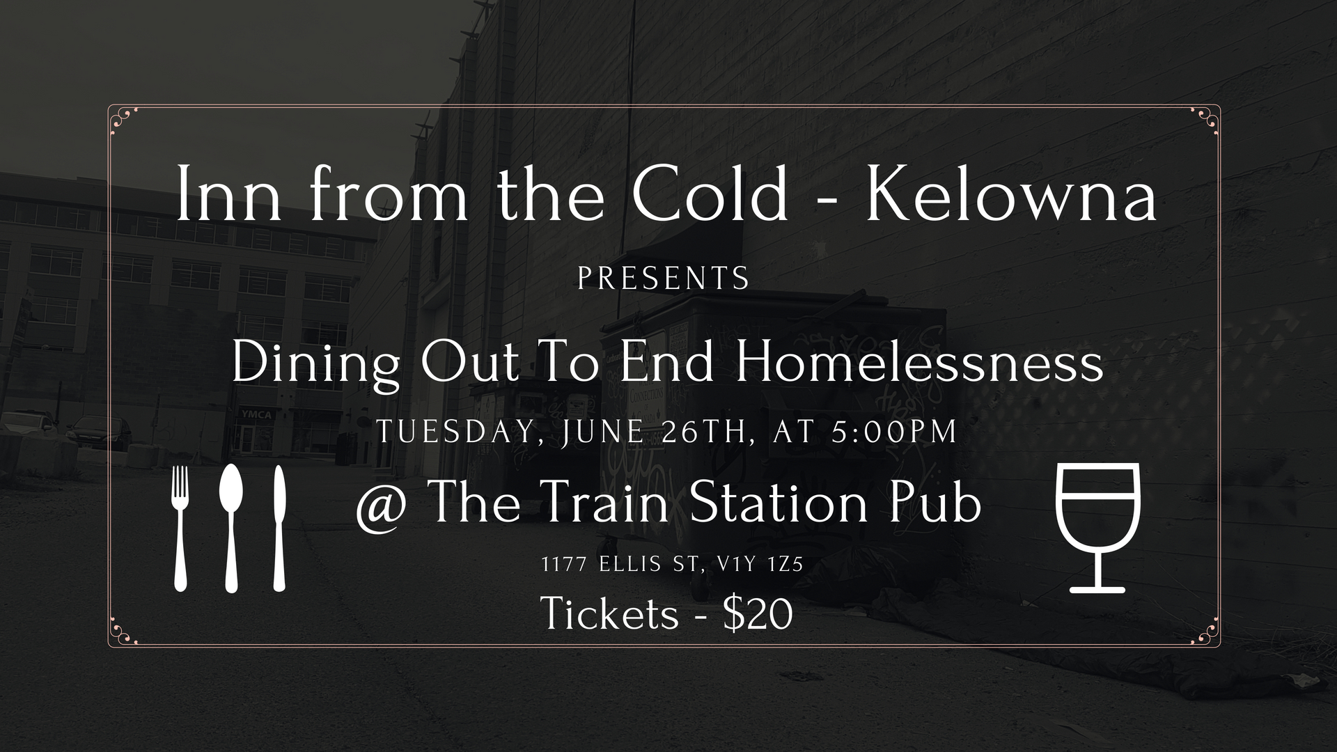 Are you HUNGRY for CHANGE? If so, help us out with our vision to end the homelessness crisis in our community and come stop by The Train Station Pub, 1177 Ellis Street, on Tuesday, June 26th, at 5:00 PM. The objective of the DINING OUT TO END HOMELESSNESS fundraising event is not only to raise much needed funds for Inn from the Cold – Kelowna, but to also raise awareness surrounding the issues of homelessness in our community. Help us make a change in the community. Tickets: $20/person Dinner options: Beef, chicken or veggie burger and fries. All meals include: your choice of a pint of beer, glass of house wine, or highball. Additional information: We will also be selling 50/50 tickets so bring some spending cash for a chance to win Inn from the Cold—Kelowna is a registered non-profit charity that provides support services to people experiencing, or at risk of, homelessness in our community. Services include: a minimal-barrier emergency shelter, outreach and case management, a homelessness prevention program, and a street soccer team. We hope to see you there!
