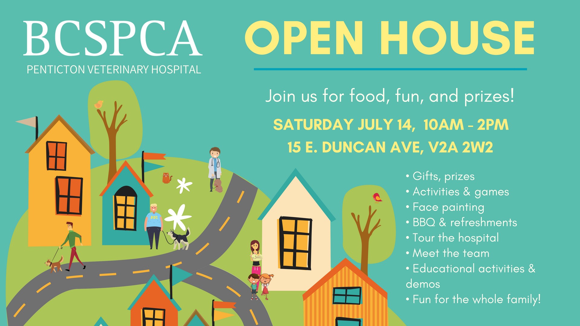 Help us celebrate BC SPCA Penticton Veterinary Hospital’s 3 Year Anniversary! Join us for our Open House on Saturday, July 14th (10:00AM – 2:00PM) at BC SPCA Penticton Veterinary Hospital (15 E. Duncan Ave Penticton, BC V2A 2W2). Free fun available for the whole family! Explore Penticton’s first Fear Free clinic, take part in fun, interactive activities, and take home some great gifts and prizes. Details: – Free Entry! – BBQ (food & beverage available for purchase) – Gifts, prizes – Activities & games – Face painting – Tour the hospital – Meet the team – Educational activities & demos – Fun for the whole family! For more information, please contact BC SPCA Penticton Veterinary Hospital at: (250) 493-1530.