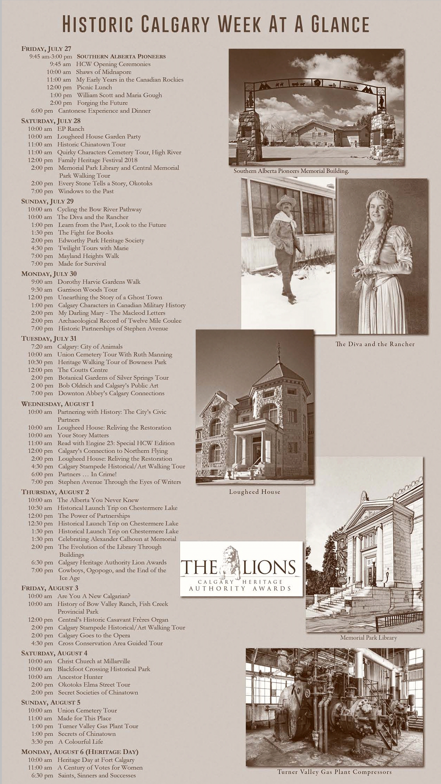 Chinook Country Historical Society (CCHS), along with our many partner organizations, is pleased to present the 28th annual Historic Calgary Week. Join us to celebrate the strength and diversity of partnerships that built our great city. Whether the partners were life partners, in business together, or linked by a common cause, our pioneers advanced our society for the benefit of all. Join us as we celebrate this year’s theme – The Power of Partnerships – and the rich history, culture, and community of Calgary and area with more than 70 events over 11 days -‐ Friday, July 27 to Monday, August 6 (Heritage Day). Enjoy walks, talks, concerts, and explore museums, heritage buildings, cemeteries, parks, and libraries. All events are open to the public and most are free of charge. Donations are gratefully appreciated. Complete the historical crossword puzzle in the Calgary Herald and discover Calgary’s historical treasures during the “History Hunt” challenge. For full program details, please visit the historiccalgaryweek.com or the CCHS Facebook page.