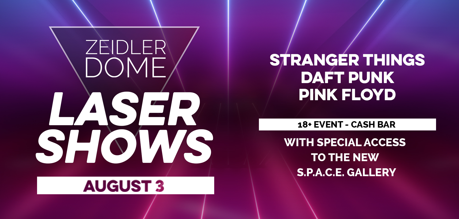 Laser Shows are back and better than ever! With the opening of the new Zeidler Dome we have taken our beloved Laser Shows and cranked them right up to 11! From vivid colours, sharper images, and speakers that will make you feel the music, sit back in our new reclining chairs, and experience the next evolution in laser cinema. On Friday, August 3, experience music like never before, with special access to S.P.A.C.E. Gallery included with your ticket. A cash bar will be available during the evening. For tickets & more information visit twose.ca/newlasers. This is an 18+ event. You will be asked to show I.D.