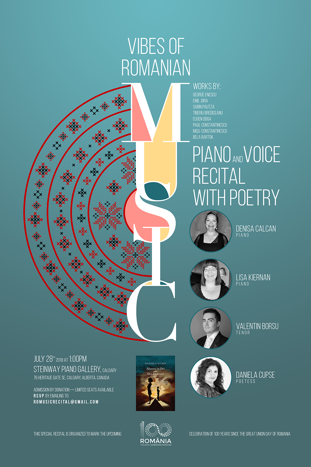 Join Pianists Denisa Calcan, and Lisa Kiernan, together with Tenor Valentin Borsu, for a Musical and Poetic Centenary Celebration of Romania’s Great Unification. It will be a delight to have presented Piano and Voice selections from a rich and various repertoire of Romanian Classical to Contemporary Music, paired with Poetry of rare sensibility, composed by Poetess Daniela Cupse. Everyone is invited to enjoy such an exquisite Saturday afternoon. There are limited seats available, so please RSVP by emailing RoMusicRecital@Gmail.com