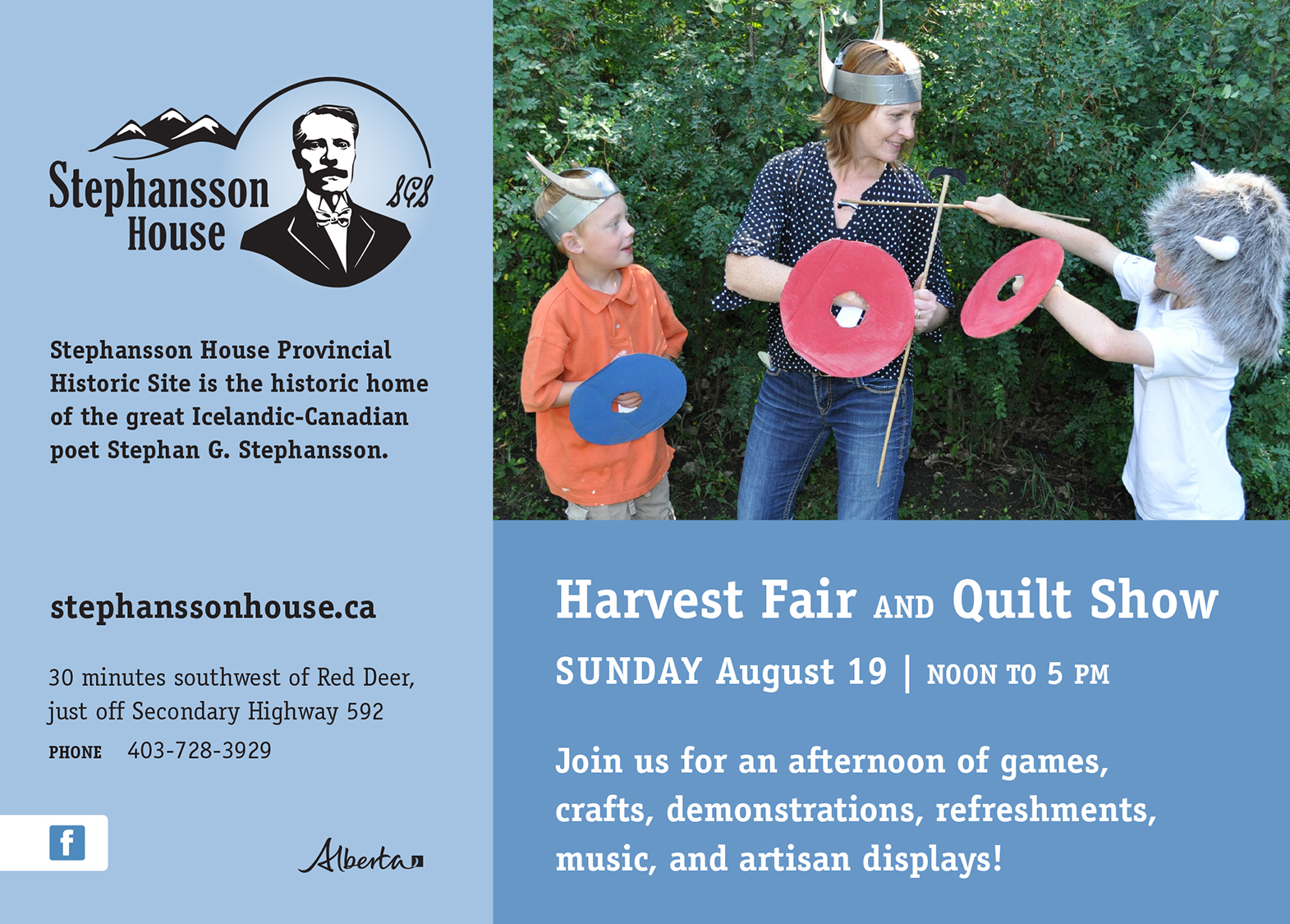 As Summer comes to a close, visit Stephansson House for an afternoon of fun and games for the whole family. Enjoy simple refreshments, musical entertainment, and demonstrations while browsing the wares of local artisans, including a cornucopia of quilts by the Spruce View Quilters! Kids of all ages are invited to bring their pennies (or get them from us) and participate in our old-fashioned carnival games and crafts. This year’s vendors include: It’s Jerky Time, Voxxlife, Happy Hippo, Muddy Otter’s Pottery, Nana’s Bits and Bobs, and more! PLEASE NOTE: THIS IS A CASH ONLY SITE