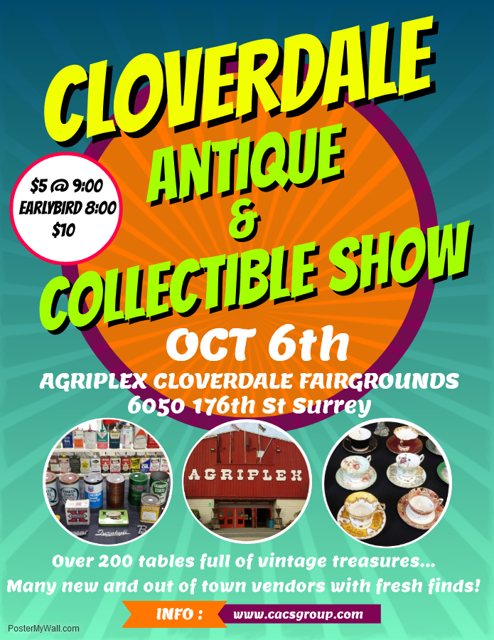 One of BCs biggest and best Antique & Collectible shows is back! Many new and 1st time vendors from all over Western Canada will be attending this show! This event is a must for any collector looking for glassware to records, home decor, toys to advertising. There is a great selection of all types of interesting collectibles and antiques. Over 200 tables and booths covering nearly 24,000 sq ft! A great place to meet, connect and network with like minded collectors! Mark your calendar for this Oct 6th. Agriplex @ Cloverdale Fairgrounds. 17798 62 Ave, Surrey Earlybird admission only $10 gets you a head start at 8:00AM General admission $5 for 9:00AM Kids FREE!