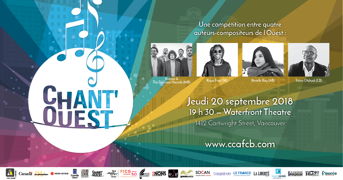 Chant’Ouest, both competition and show, is in Vancouver this year ! Come cheer on emerging singer-songwriters from North and Western Canada. Each of the artists was the winner of a provincial music competition in their respective province. ARTISTS: – Jérémie & The Delicious Hounds (Manitoba) https://soundcloud.com/delicious-hounds – Kaya Free (Saskatchewan) https://www.youtube.com/channel/UCDv1N7Q_z4nPwGISOFzjYKQ – Renelle Ray (Alberta) https://www.youtube.com/watch?v=qMXVRXcsb20 – Trésor Otshudi (Colombie-Britannique) https://www.youtube.com/user/tresorofficiel They will be measure uo to each other at Chant’Ouest to determine the two winners of this great contest. The two winners will have the opportunity to represent Canada’s Nort and West at the renowned Granby International song Festival in Quebec in 2019. Tickets are now on sale for 20 $. Visit the online ticket office to reserve your seats. Hurry up, places are limited ! More specifically, Chant’Ouest is a unique platform for francophone artists from northern and western Canada to get their first experience in the music industry. In addition to a most rewarding stage experience, this platform offers candidates individual training supervised by a professional team. Whether or not the artists win the highest honors, they all come out winners, enriched by stage experience, opportunites, friendships and dreams.