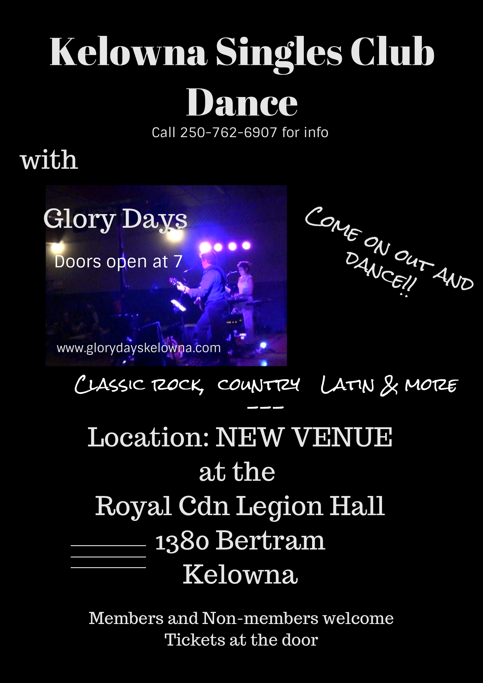 The Kelowna Singles Club is a long standing organization committed to providing entertainment for the single folks in the valley. All are welcome to the Kelowna Singles Club Dance Saturday night Aug 18/18. Bring your dancing shoes and boogie, waltz, 2-step, rumba and rock ‘n’ roll to the songs you love to remember. Bring a partner or meet a new one. Entertainment provided by Glory Days – a versatile and dynamic Duo, popular in the OK Valley for their great repertoire, full sound and irresistible dance rhythms. Check out their info at http://www.glorydayskelowna.com Tickets at the door. Includes a light lunch. For members and non-members alike. Bring a partner or meet a new one.