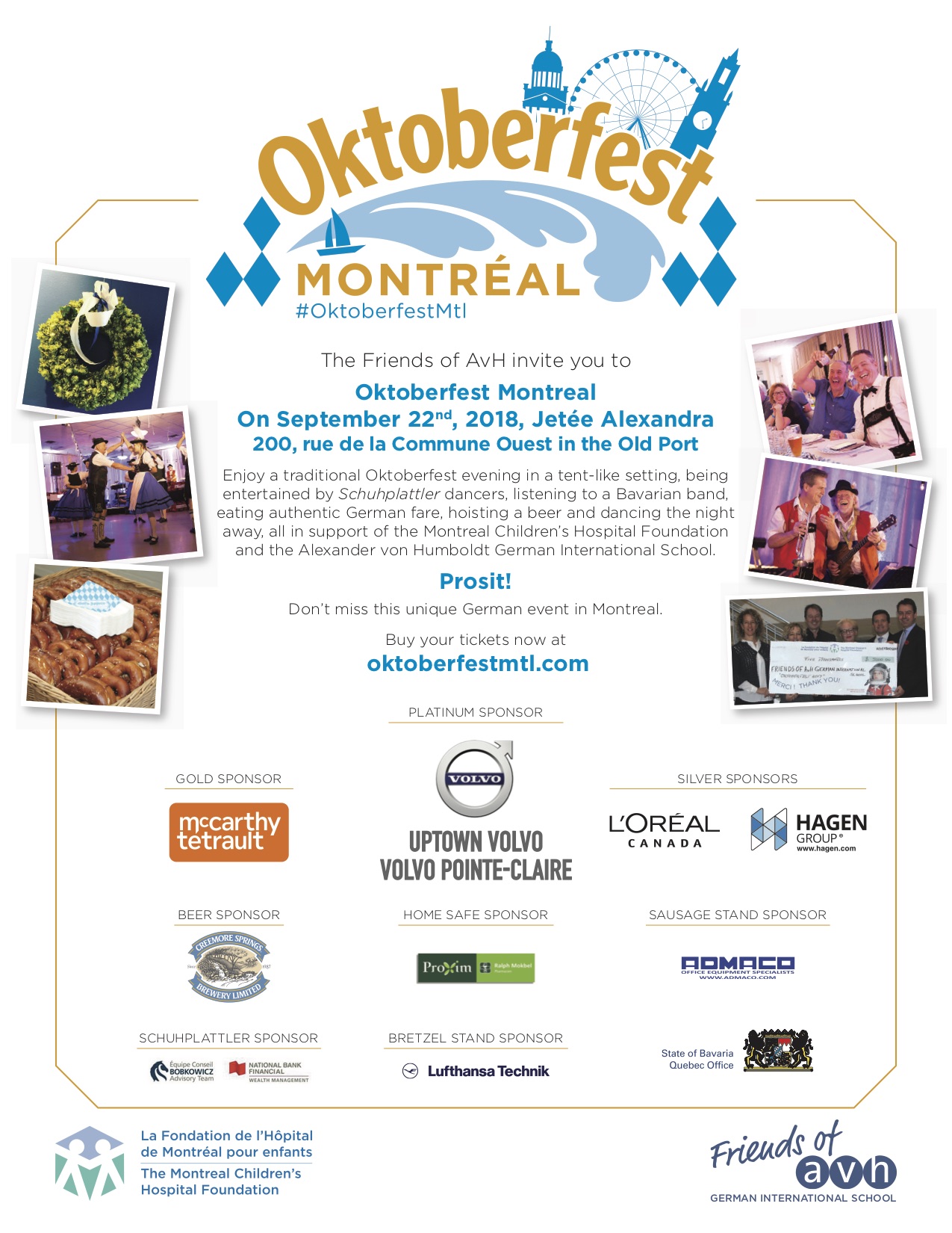 Enjoy a traditional Oktoberfest evening in a tent-like setting, being entertained by Schuhplattler dancers, listening to a Bavarian band, eating authentic German fare, hoisting a beer and dancing the night away, all in support of the Montreal Children’s Hospital Foundation and the Alexander von Humboldt German International School.