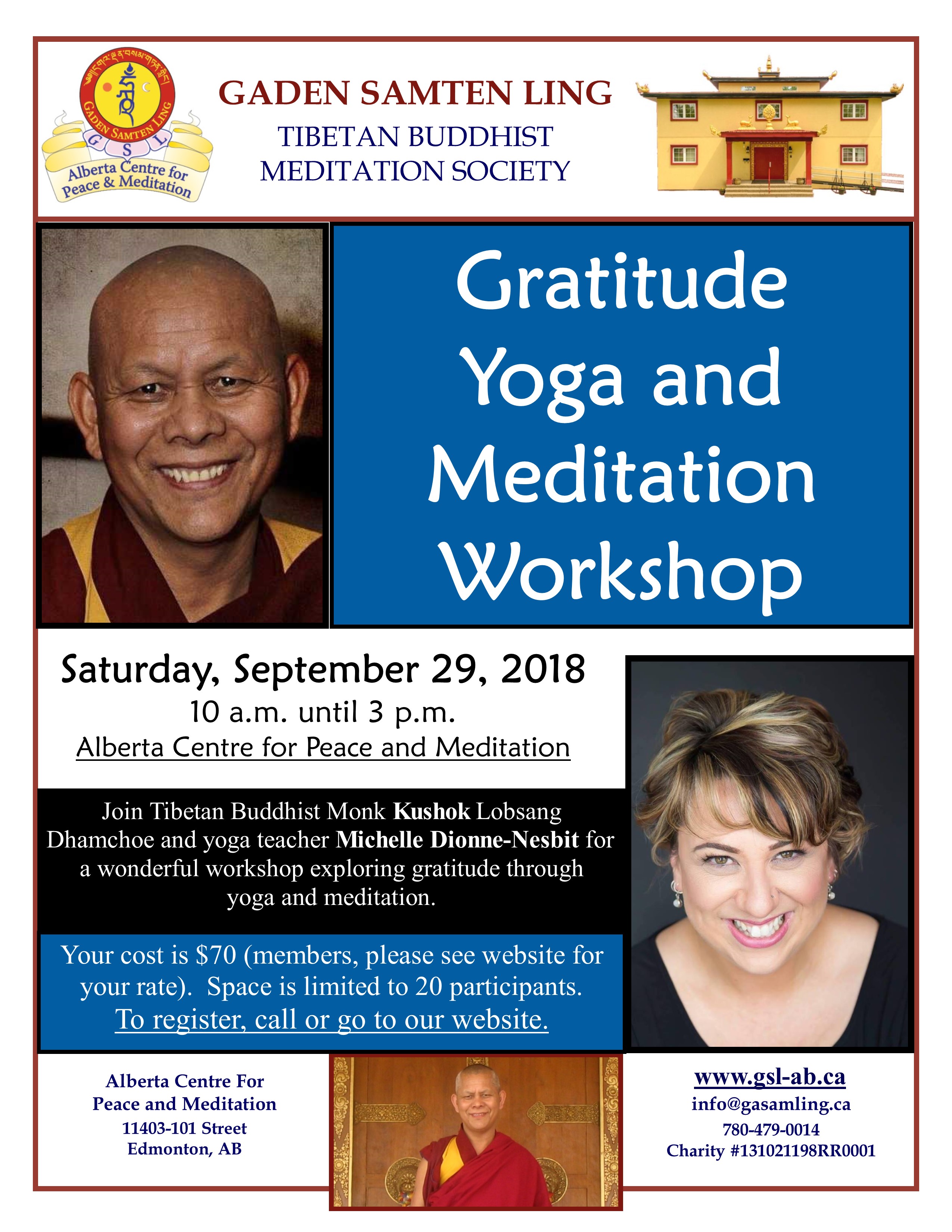 COURSE DESCRIPTION: Join Kushok and Michelle Dionne-Nisbet for a wonderful one-day workshop exploring gratitude through yoga and meditation practice. Gratitude, the quality of being thankful, holds an essential place in both meditation and yoga practice. In yoga, being thankful for whatever capacity our body is able to offer can bring about greater peace with our physical practice as it evolves day by day. In meditation, having a mind that experiences gratitude can lead to greater daily joy, peace of mind through cultivating satisfaction, and can ultimately lead us to develop the heartfelt wish to repay the kindness of others. TARGET AUDIENCE: Anyone with an interest in exploring yoga and meditation is welcome to attend this workshop. COURSE DATE: Satuday, September 29 from 10:00 a.m. to 3:00 p.m. COURSE FEE: $70 for Non-Members and Lotus Members $63 for Jewel Members $56 for Vajra Members REGISTRATION DEADLINE: Space is limited to 20 participants so please register early. Payment in full is required to guarantee your spot. LUNCH: Please bring your own lunch to enjoy in our dining hall downstairs. We have a fridge and microwave in the kitchen if you need to cool or reheat anything as well as utensils and napkins. HOW TO REGISTER: Register online (preferred). If you are unable to register online, please phone our office at 780-479-0014. WHAT TO BRING: – yoga mat – blanket or shawl – yoga strap or belt from a bathrobe – Notebook – Pen – Note: Cushions and chairs are available for meditation