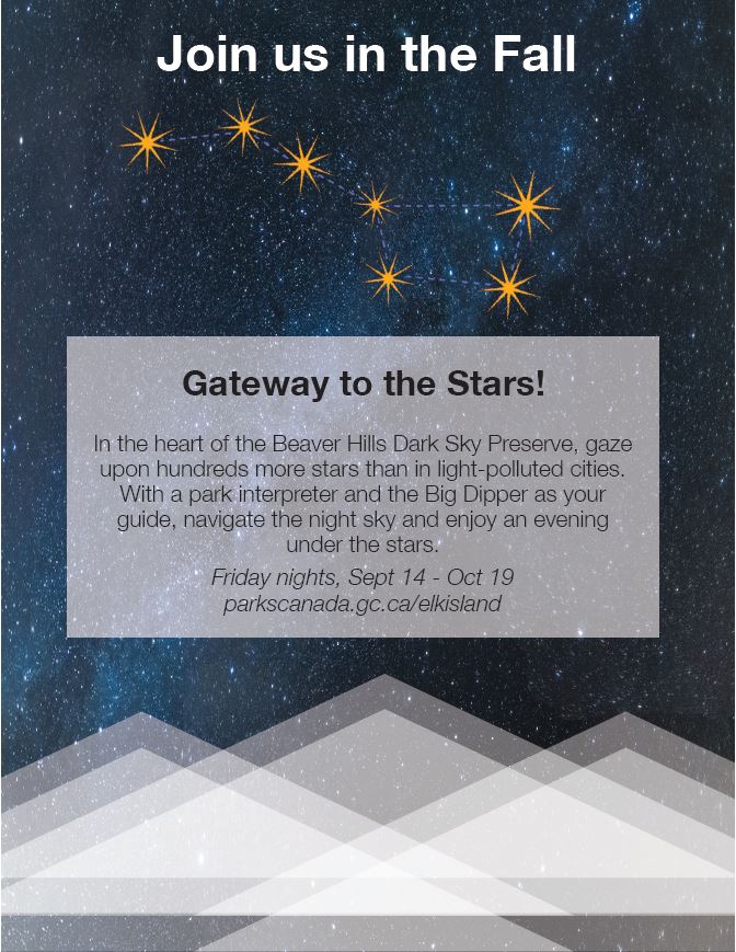 Experience the wonder of Elk Island’s night sky. In the heart of the Beaver Hills Dark Sky Preserve, escape the city and gaze upon the countless stars in our galaxy with a friendly park interpreter. Register in advance and meet at the Astotin Lake Beach Parking Lot in Elk Island National Park. Cost per person: $15. Contact 780-922-5790 to book. For further details: https://www.pc.gc.ca/en/pn-np/ab/elkisland/activ/activ5