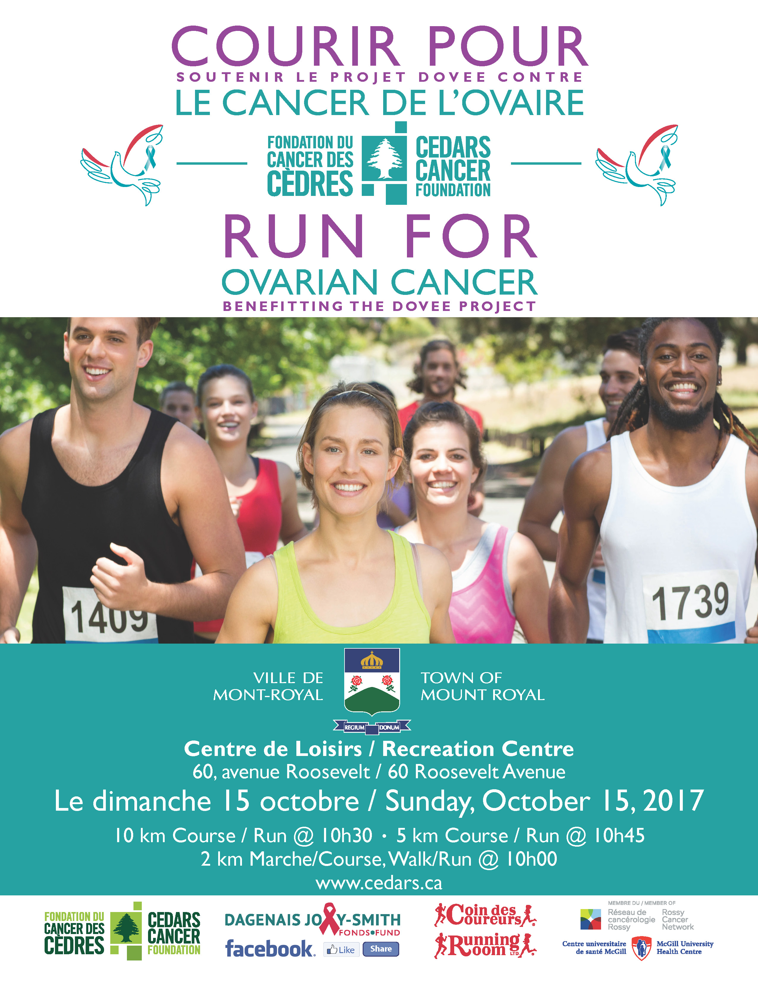 Cedars Cancer Foundation & Co Chairs Dominique Dagenais & Max Joly-Smith invite you to our 3rd Annual Run /Walk for Ovarian Cancer on Sunday, October 14th, 2018 in Town of Mount Royal. Choose the 10k run, 5k run, or the 2k walk/run mile option. Our 10k & 5k run is timed and scored! The Dagenais Joly-Smith Fund is dedicated to supporting The DOvEE Project under the leadership of Dr. Lucy Gilbert. The DOvEE Project is committed to raising awareness of Ovarian & Endometrial cancers, advocating for early diagnostic testing, and supporting ovarian cancer patients and their families.