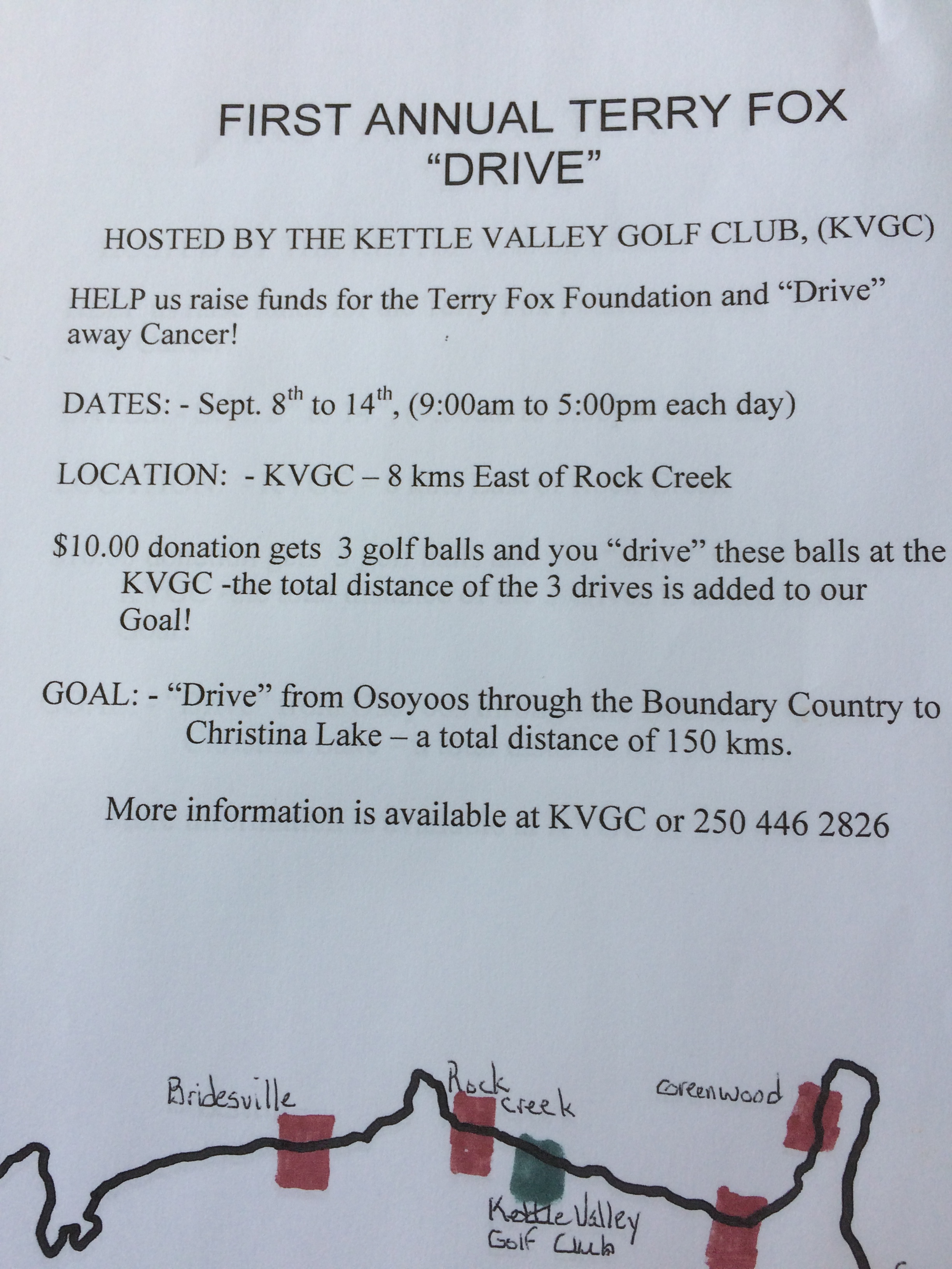 For a $10 donation you get three golf balls to Drive at the Kettle Valley Golf Course near Rock Creek, BC. The total distance will be added to gether and the goal is to drive the distance from Osoyoos to Christina Lake. Prizes for longest drive in all age categories ( child, teen, women and men) as well as some hidden prizes. Event ends at 5:00 pm on Friday, september 14. Come golf 18 holes and have your $10 donation deducted from the green fees. To book a time call Kettle Valley Golf course at 250-446-2826