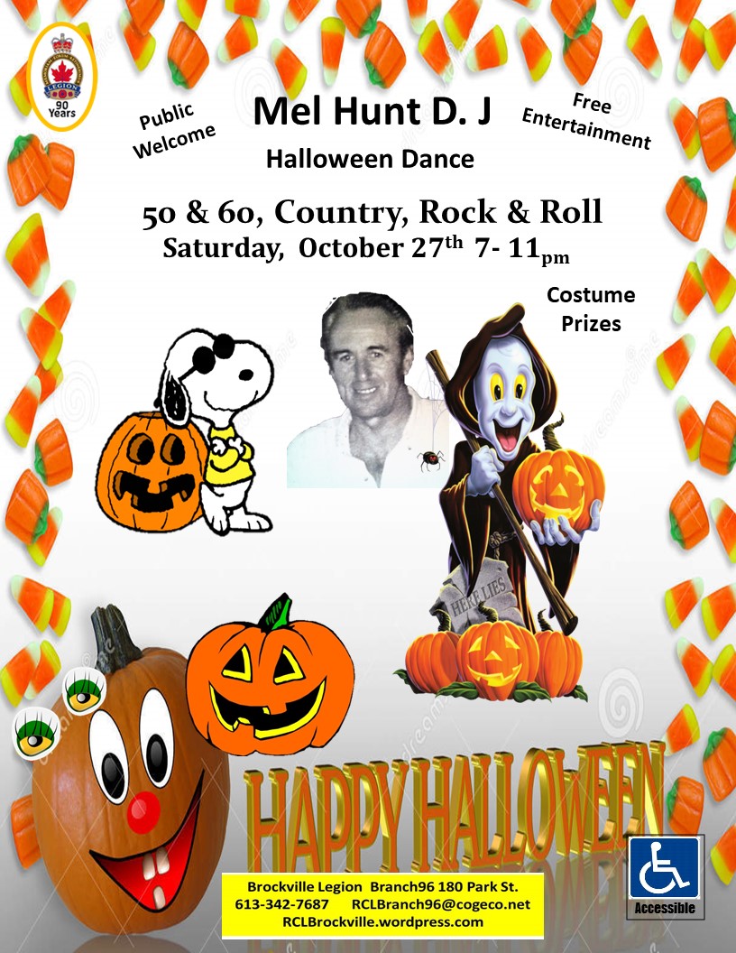 Mel Hunt provides music for a spooktacular evening of fun with costume prizes from 7pm-11pm in the lower lounge of the Brockville Legion.