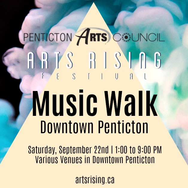 The Penticton Arts Council’s Arts Rising Music Walk includes numerous venues in downtown Penticton. Music Walk schedule of musical performances. 1:00 pm Smugglers Smoke House + The People’s Soda (215 Winnipeg Street) Musician: Ari Neufeld 1:00 pm Matheson + Grove Fine Art (205 Martin St) Musicians: Martin Street Studio Mates 2:00 pm Tugs Tap House (260 Martin Street) Musician: The Orange Sol with Bobby Bovenzi 3:00 pm Mile Zero Wine Bar (200 Ellis Street) Musicians: Maiya Robbie + Tavis Weir 4:00 pm Time Winery (361 Martin Street) Musician: Daryl O’Neill 5:00 pm The Cellar Wine Bar (412 Main Street) Musicians: Crawford + Crossley Trio 8:00 pm Craft Corner Kitchen (557 Main Street) Musicians: .:0:. (Brazilian Jazz Trio) The day of music continues with Arts Rising at The Elite Restaurant (Please note the schedule, venues + participants may change)