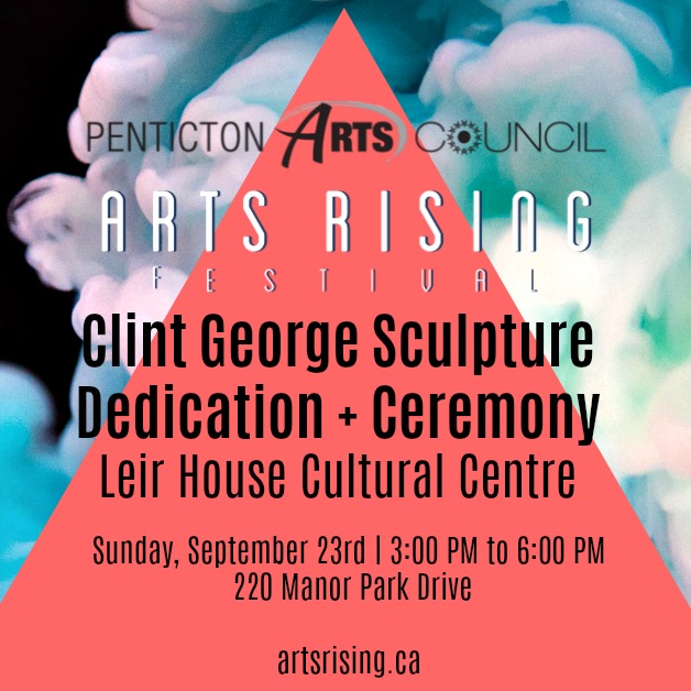 Please join us at the Leir House Cultural Centre on Sunday, September 23rd for the final event of Penticton Arts Council’s Arts Rising Festival; the dedication and ceremony of the Clint George sculpture, “Bringing Back the Salmon Chief”. BBQ to follow. This is a free event, but we ask that you reserve a ticket to help us with the BBQ numbers.