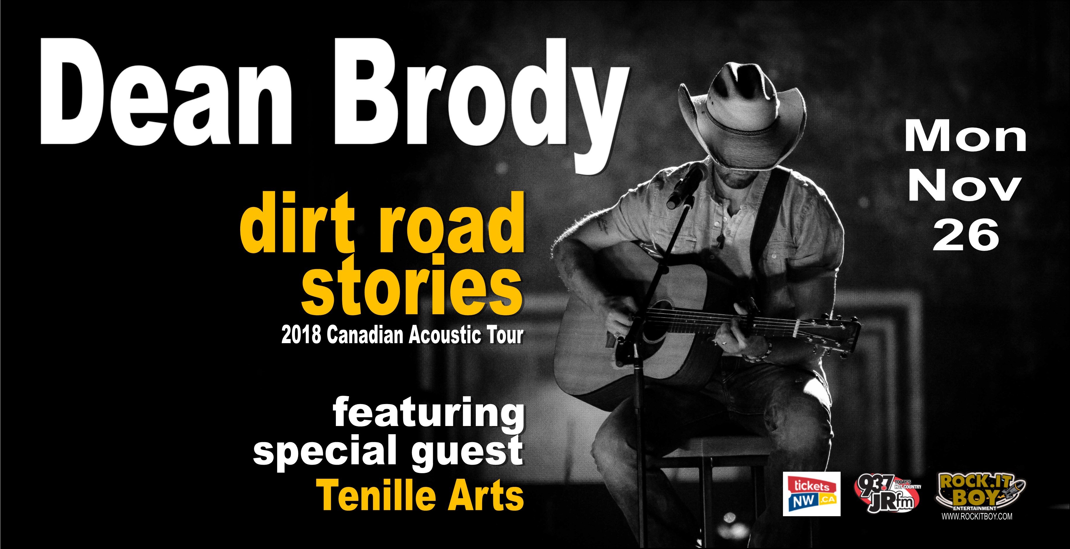 Rock.It Boy Entertainment presents Dean Brody: Dirt Road Stories Featuring special guest Tenille Arts November 26th @ 7:30pm – Massey Theatre, 735 8th Avenue, New Westminster Tickets – Call 604-521-5050 or visit: http://www.masseytheatre.com/event/dean-brody-dirt-road-stories/ Current CCMA Fan’s Choice, two-time Juno Award winning artist and celebrated songwriter, Dean Brody will be hitting the road this fall for the Dirt Road Stories Tour. This compelling, intimate acoustic tour showcases Brody’s depth as a songwriter, and his unparalleled ability to bring storytelling to the forefront of country music and is presented by Rock.It Boy Entertainment and 93.7 JRFM with special guest Tenille Arts.