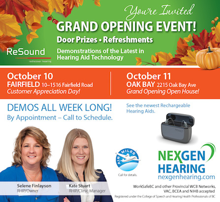 Join us for our Customer Appreciation Day at NexGen Hearing Fairfield, as we celebrate the Grand Opening of the NexGen Hearing Oak Bay new location! Door prizes, refreshments, and demos all week (by appointment) of the latest hearing aid technology.