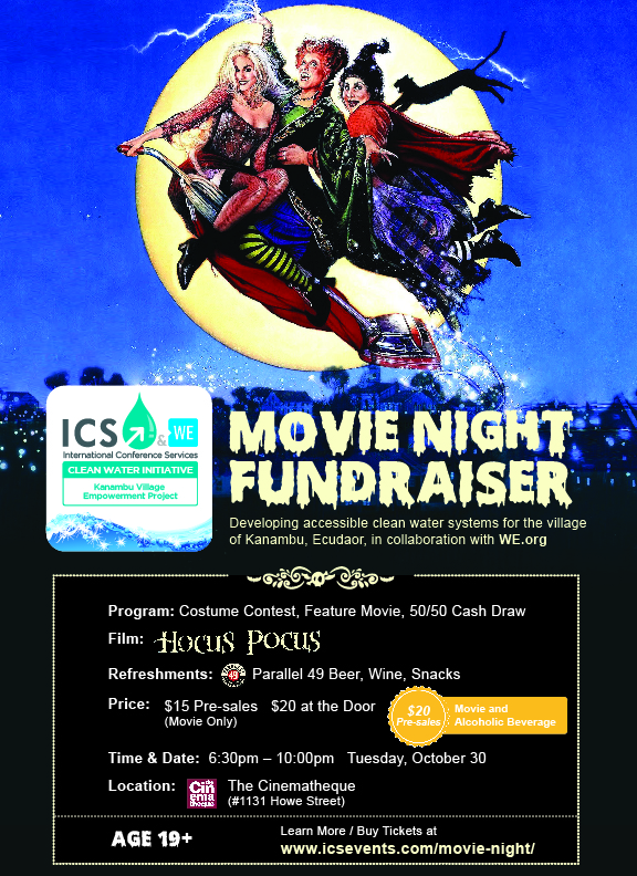 Program: Costume Contest, Feature Movie, 50/50 Cash Draw (do not forget to bring cash!) Film: Hocus Pocus Refreshments: Parallel 49 Beer, Wine, Snacks Price: $15 Pre-Sales (Movies Only) $20 at the Door (Movies and Alcoholic Beverages) Time & Date: 6:30pm – 10:00pm Tuesday, October 30 Location: The Cinematheque (#200, 1131 Howe St) **Note, you must be 19+ to attend this event. Hocus Pocus is a 1993 American cult classic film directed by Kenny Ortega, starring Bette Midler, Kathy Najimy, and Sarah Jessica Parker. It follows the villainous trio of witches, who are inadvertently resurrected by a teenage male virgin in Salem, Massachusetts. All proceeds go to the ICS and WE Villages water project in Kanambu, Ecuador International Conference Services is funding a community led water development project in Kanambu, Ecuador with a $100,000 contribution. We have partnered with WE Villages because they address poverty using a sustainable, multi-faceted approach. Your contribution will be matched dollar for dollar by ICS. To learn more: icsevents.com/the-difference/giving-back-as-a-mantra/we/