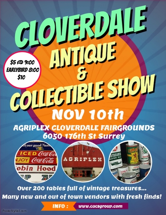 One of BCs biggest and best Antique & Collectible shows is back! Many new and 1st time vendors from all over Western Canada will be attending this show! This event is a must for any collector looking for glassware to records, home decor, toys to advertising. There is a great selection of all types of interesting collectibles and antiques. Over 200 tables and booths covering nearly 24,000 sq ft! A great place to meet, connect and network with like minded collectors! Mark your calendar for this Oct 6th. Agriplex @ Cloverdale Fairgrounds. 17798 62 Ave, Surrey Earlybird admission only $10 gets you a head start at 8:00AM General admission $5 for 9:00AM-3:00PM Kids FREE!