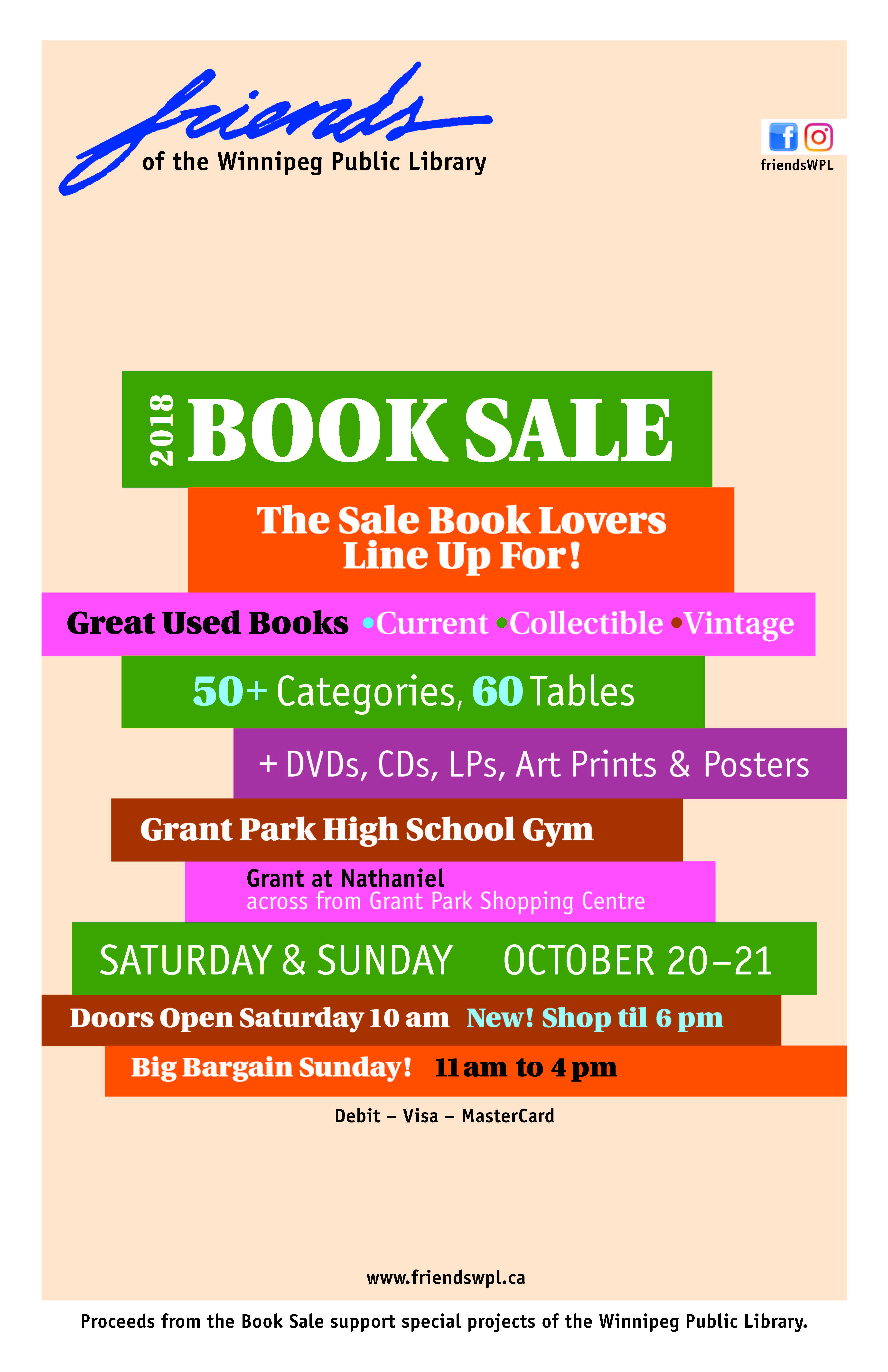 The annual Friends of the Library Fall Book Sale is Saturday Oct. 20: 10am-6pm and Sunday Oct. 21: 11am-4pm. 60 big tables of good gently used books of every kind: fiction, mystery, history, comics to classics, cookbooks to collectibles. Plus CDs, DVDs, LPs and Art Prints & Posters. Grant Park High School, Grant at Nathanial. Cash, Debit, Visa, MC. Donations still welcome: label box or bag FRIENDS and drop off at any Winnipeg Library Branch. The Friends of the Library raises funds to support special Winnipeg Public Library projects such as the Writer in Residence program, special children’s reading programs, and much more. http://www.friendswpl.ca Contact: Aviva 204-801-8056