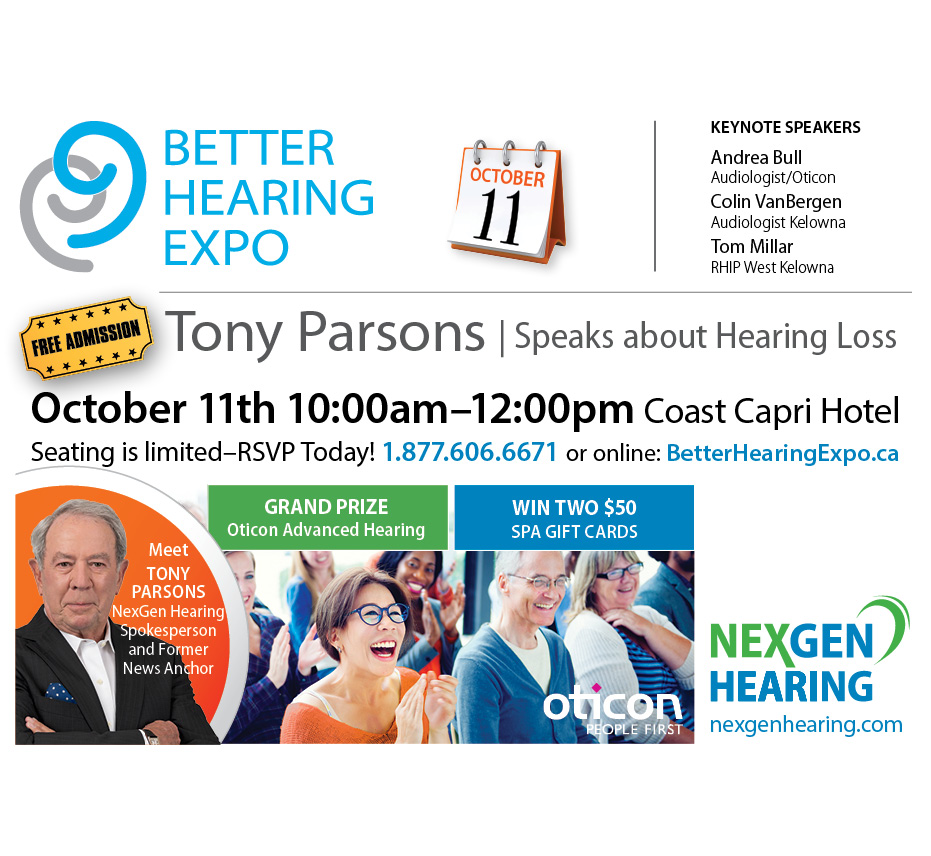 We’re excited to announce our Better Hearing Expo on October 11th, 10am-12pm at the Coast Capri Hotel in Kelowna! Meet Tony Parsons, NexGen Hearing Spokesperson and former News Anchor; Andrea Bull, Audiologist from Oticon Canada; Colin VanBergen, Audiologist from NexGen Hearing Kelowna; and Tom Millar, RHIP from NexGen Hearing West Kelowna. Learn about the challenges of Hearing Loss and the latest Hearing Aid Technology. The refreshments and prizes at NexGen Hearing’s Better Hearing Expo’s are always a big hit! Enter to win two $50 Spa Gift Cards, and the Grand Prize, a set of advanced Oticon hearing aids valued at $5,000! There’s no cost to attend, but space is limited, so register now at https://www.nexgenhearing.com/coast-capri-hotel/ or call 1.877.606.6671.
