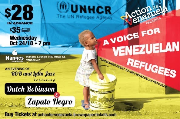 An evening of R&B and Latin Jazz, is a fundraising event for Venezuelan refugees organized by Action for Venezuela on behalf of the United Nations High Commissioner for Refugees (UNHCR). Special presentations by: Dutch Robinson and his band, maestros at delivering a powerful, soulful, and heartfelt performance with a mix of both classic Soul covers and outstanding originals. Zapato Negro delivering an eclectic and exciting performance with their unique blend of progressive jazz and Afro-Caribbean rhythms
