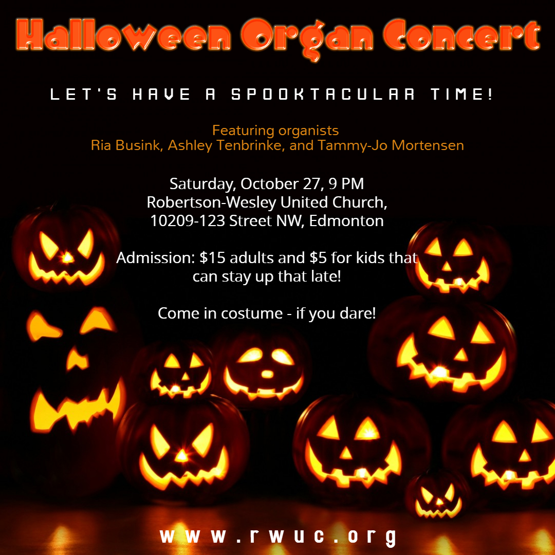 Be prepared to be entertained and experience the return of the Halloween Spooky Organ Concert! This ghoulish event in the darkened sanctuary features three organists: Ria Busink, Ashley Tenbrinke and Tammy-Jo Mortensen. They will perform some seasonal favourites and there will be some sweet treats. This event is not for the faint of heart!