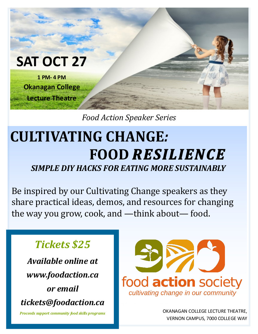 Join Food Action in the Okanagan College Lecture Theater Saturday October 27 for our first ever Cultivating Change speaker series: Food Resilience and Simple DIY hacks for healthy resilient living. We hope to inspire you with some easy, practical ideas for sustainable living. Our speakers share what they’ve learned in their search for sustainability, including their best do’s and dont’s. Tickets are $25.00, and seats are limited, so get them now. All proceeds support Food Action programming in our community. If you’d like to sponsor a ticket for someone who can’t afford to attend, please get in touch with us at info@foodaction.ca TOPICS AND SPEAKERS: Currently we have scheduled speakers on reducing food plastic & waste, food storage, fall gardening, and a DIY plant-based burger demo! This will be a jam-packed session with a focus on practical information, tips, and tricks for reducing your footprint and your grocery budget, while increasing your own food security. You’ll also receive free follow-up plans, resources, recipes, and links to related information.