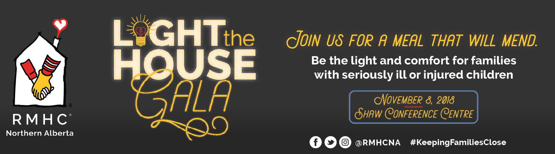 The secret is out! Join us for the inaugural Light the House Gala on November 8, 2018. This is your opportunity to become a hero for the hundreds of families who utilize the Ronald McDonald House in Edmonton every single year, and enjoy an elegant evening of fun, entertainment, and a culinary showcase with some of Edmonton’s top chefs! Tickets start at $350/person and are available now. Get your tickets today at rmhcna.org/gala.