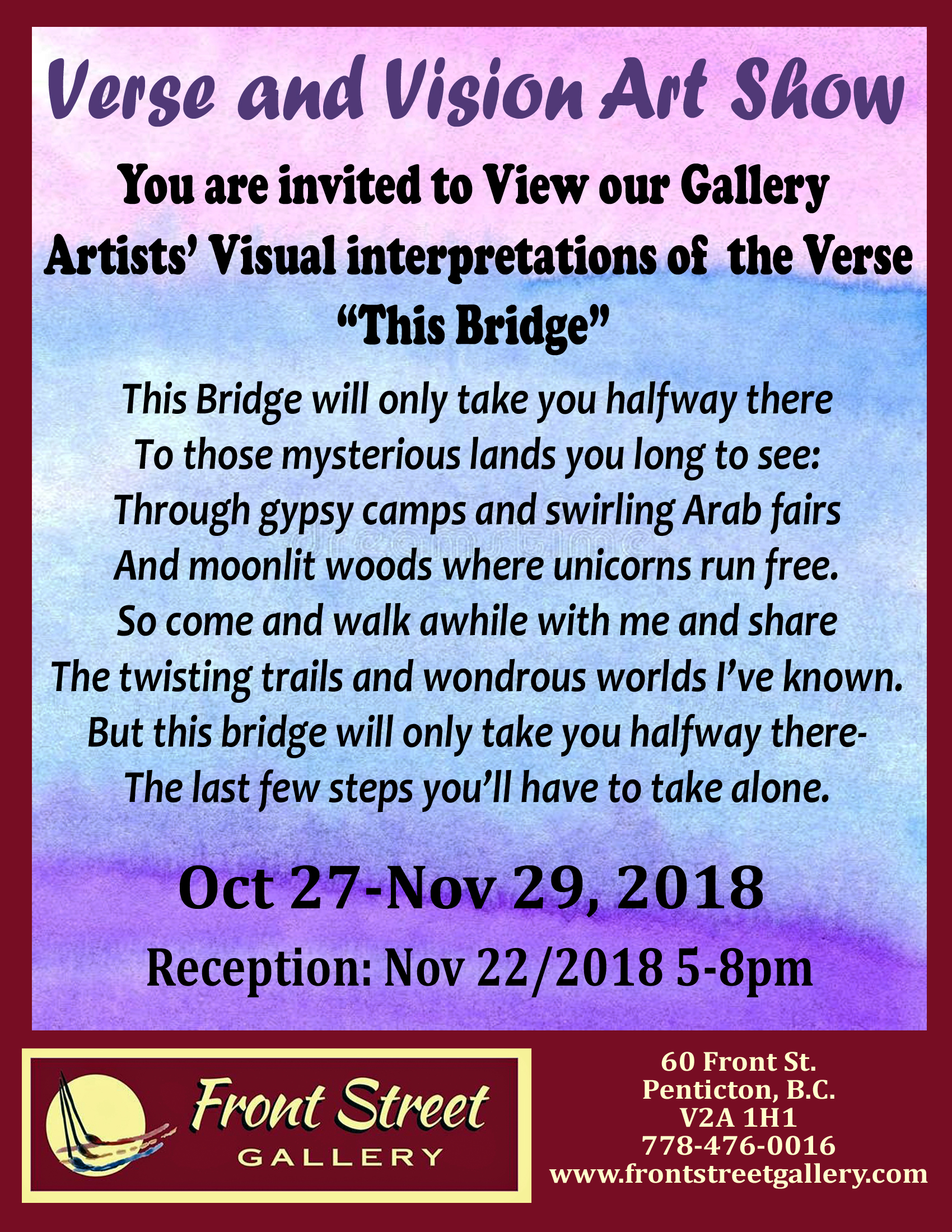 Front Street Gallery Resident Artists’ Art Show “Verse and Vision” Oct 27-Nov 29 /2018 Expanded version: Front Street Gallery celebrates our current Resident Artists’ Art Show. We invite you to join us in the gallery to see new works. Paintings, prints and cards are available for purchase, rent or commission. Resident Artist in attendance: Nov 22/2018 5-8 pm Reception: Nov 22 /2018 5-8 pm Please join us to view the unique visual interpretations of the following Verse by our Resident Gallery Artists. “The Bridge” This Bridge will only take you halfway there To those mysterious lands you long to see: Through gypsy camps and swirling Arab fairs And moonlit woods where unicorns run free. So come and walk awhile with me and share The twisting trails and wondrous worlds I’ve known. But this bridge will only take you halfway there- The last few steps you’ll have to take alone.