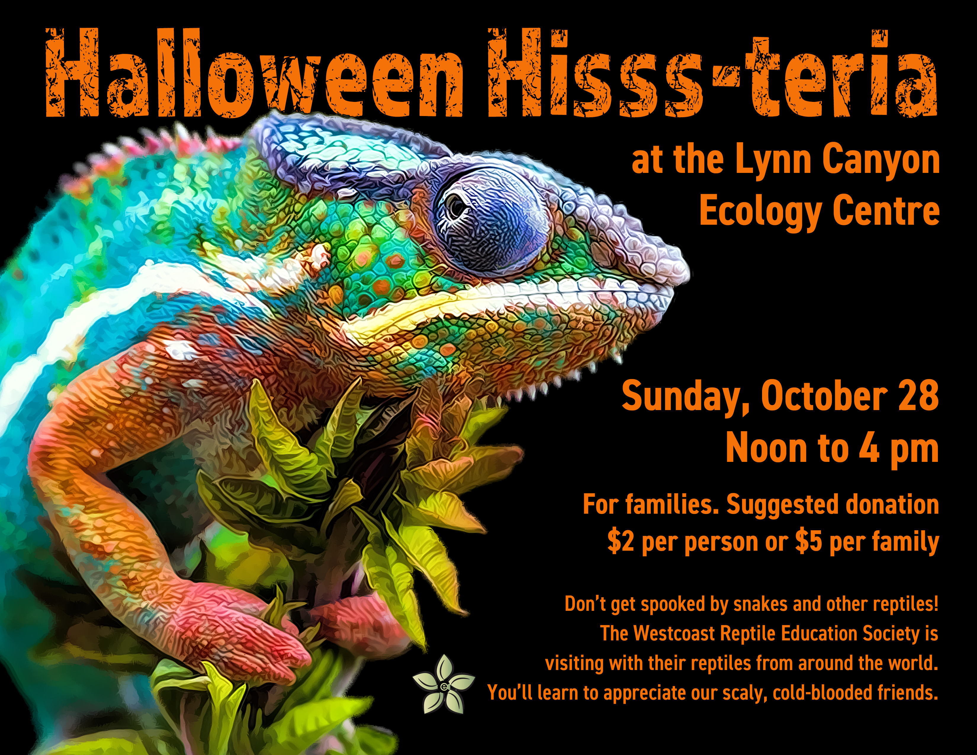 Don’t get spooked by snakes and other reptiles! Join the Westcoast Reptile Education Society for our annual visit with reptiles from around the world, here at the Ecology Centre. You’ll learn to love and appreciate our scaly, cold-blooded friends.