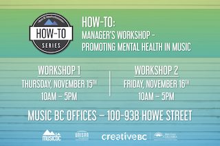 Music BC, in partnership with Unison Benevolent Fund, is pleased to be hosting two mental health workshops for managers! The two Managers’ Workshops, Promoting Mental Health in Music will be led by Australian psychologist Dr. Chris Stevens on Thursday November 15th & Friday November 16th at Music BC. These intimate workshops will focus on addressing the mental health issues within the music industry including how to: understand mental health as a continuum (from vibrancy to illness); promote good health for self and others; problem solve relevant psychosocial issues at work to provide a heath-enhancing environment. Please visit the website to apply for the workshop.