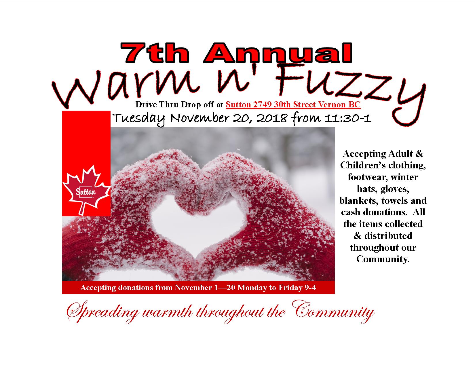 Sutton Group Lakefront Realty (2002) Ltd. is hosting their 7th annual Warm n Fuzzy Collection! This warm weather outer wear is utilized by Gateway Shelter, Howard House, Woman’s Transition House and spread throughout the community to meet the need of keeping our citizens warm and secure. Our crew delivers to Howard House and the agencies meet there to take away what they need for those that rely on them. You can drop off your donations on November 20th between 11:30AM-1PM in the parking lot of Sutton during their “drive thru”