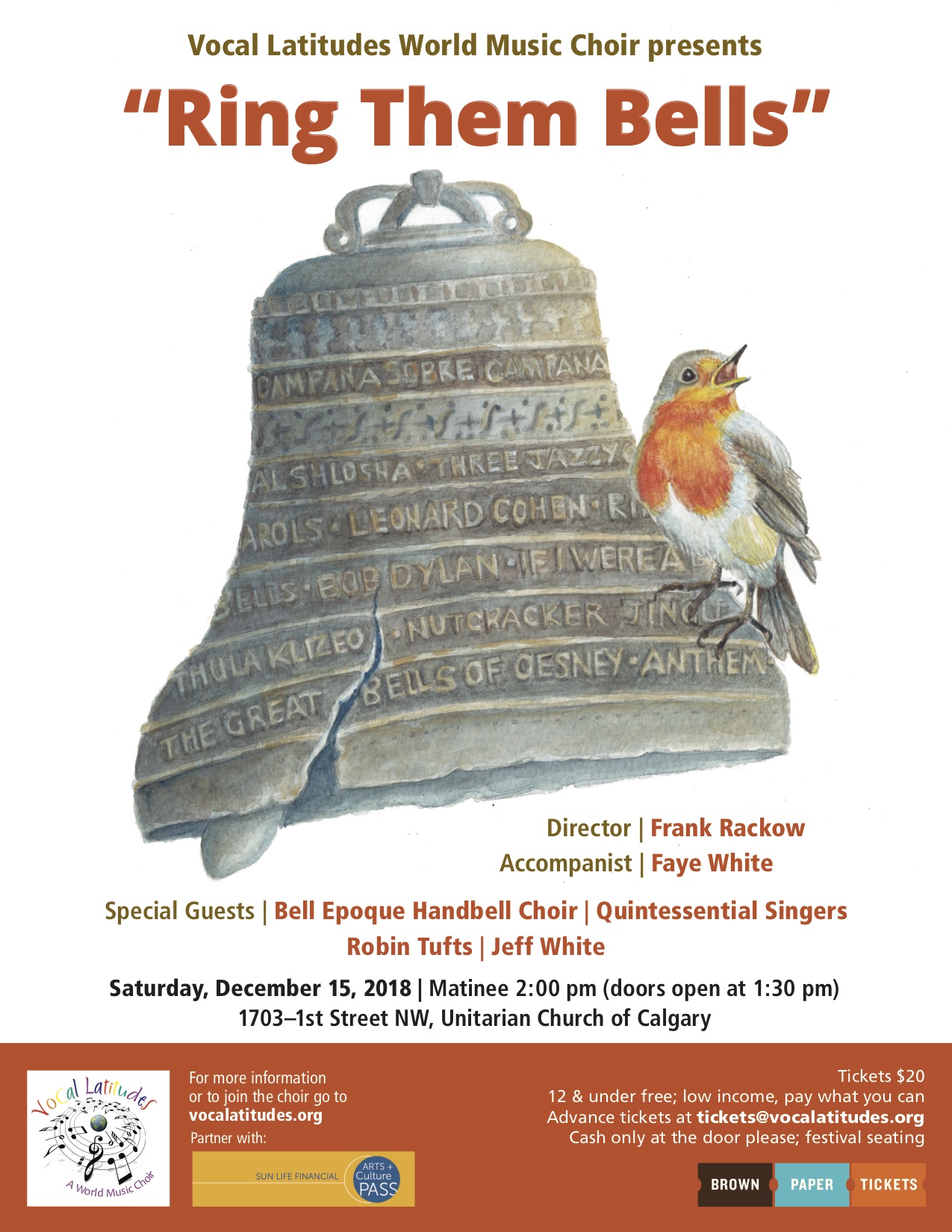Vocal Latitudes Choir under the direction of Frank Rackow presents, Ring Them Bells, a medley of classics, gospel, folk, jazz and world music to mark the season and ring in hope for peace in the world. With accompanist, Faye White, Robin Tufts and Jeff White and the Bell Epoque Handbell Choir, December 15th, at 2:00 pm. Unitarian Church, 1703 – 1 St. N.W. $20 or pay what you can