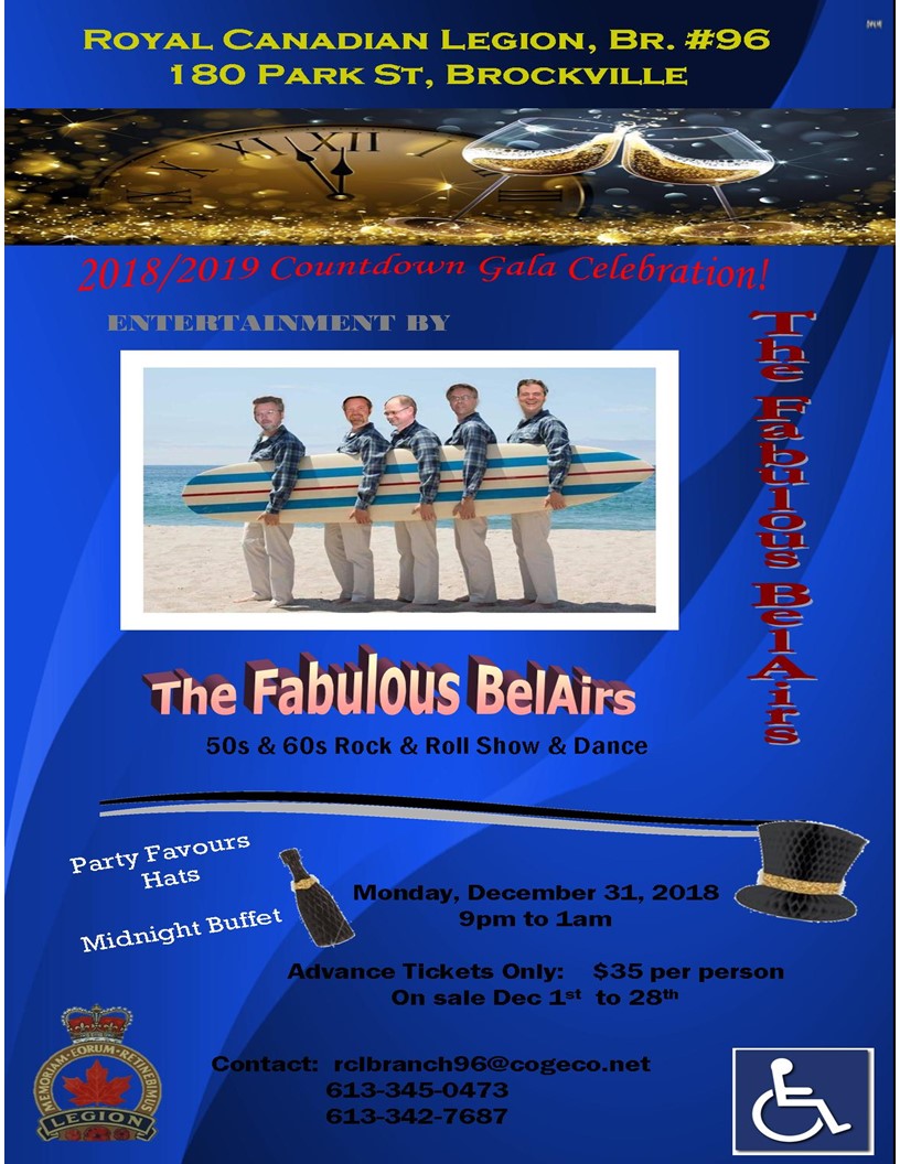 The “Fabulous Bel-Airs bring in the New Year at the Brockville Legion from 9pm-1am.